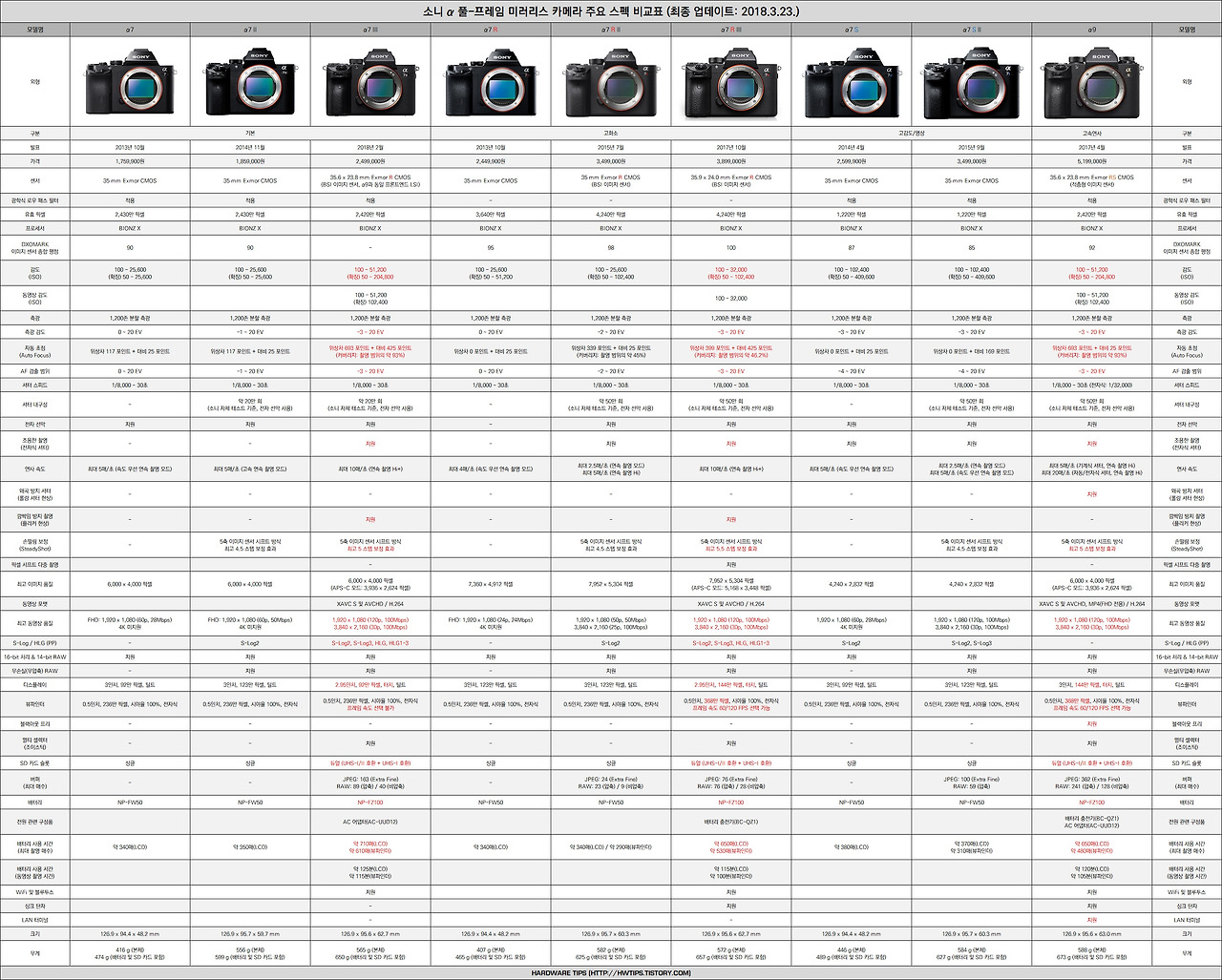 이 내용에 따르면 소니의 풀프레임 미러리스 카메라 중 최상위 카메라인 A9에서 몇가지 기능만을 생략하거나 낮춘 수준(이게 일반적이긴 하지만...)으로 H/W적인 기능의 상당부분은 상위 기종과 거의 흡사한 수준입니다.