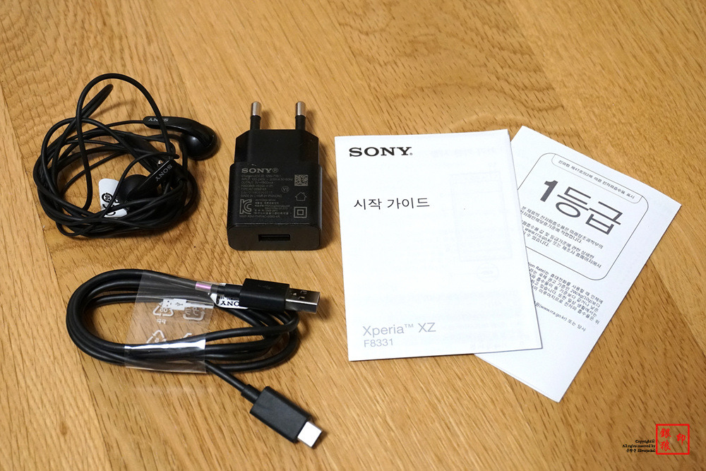 '엑스페리아 XZ'에 번들된 메뉴얼과 케이블, 어댑터, 이어폰입니다.