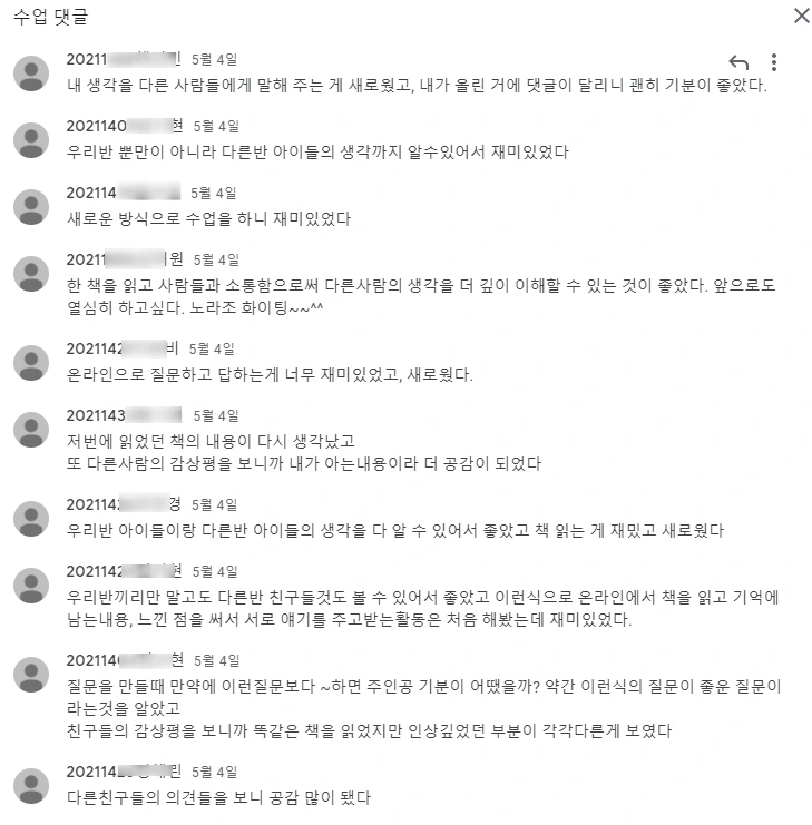 코로나 시국에 이런 모둠활동이 어려웠을 때는 온라인상에서 서로 인상 깊은 장면을 쓰거나 질문을 하고 댓글로 소통하는 방식으로 수업을 한 적도 있었다.