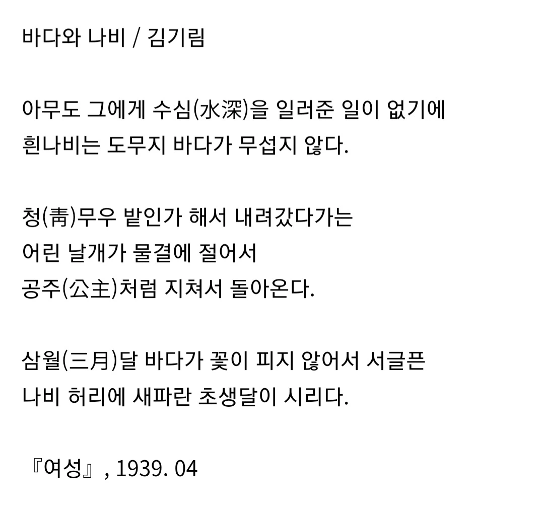 시골 중학교에서 공부 꽤나 한다고 해서 도시로 진학한 몇몇 아이들은 좀처럼 맥을 못 췄다. 나도 그중 하나였다. 그때 김기림의 <바다와 나비>를 배우며 생각했다. 청무 밭인가 해서 내려갔다가 물결에 절어서 지쳐 돌아온 나비가 낯설지가 않다고.