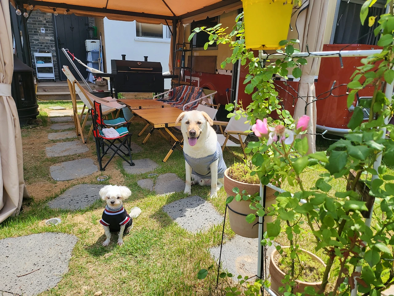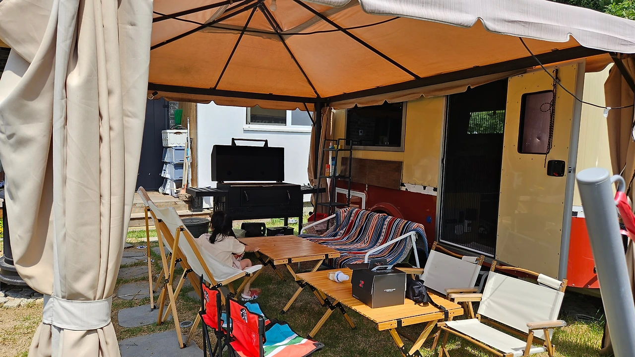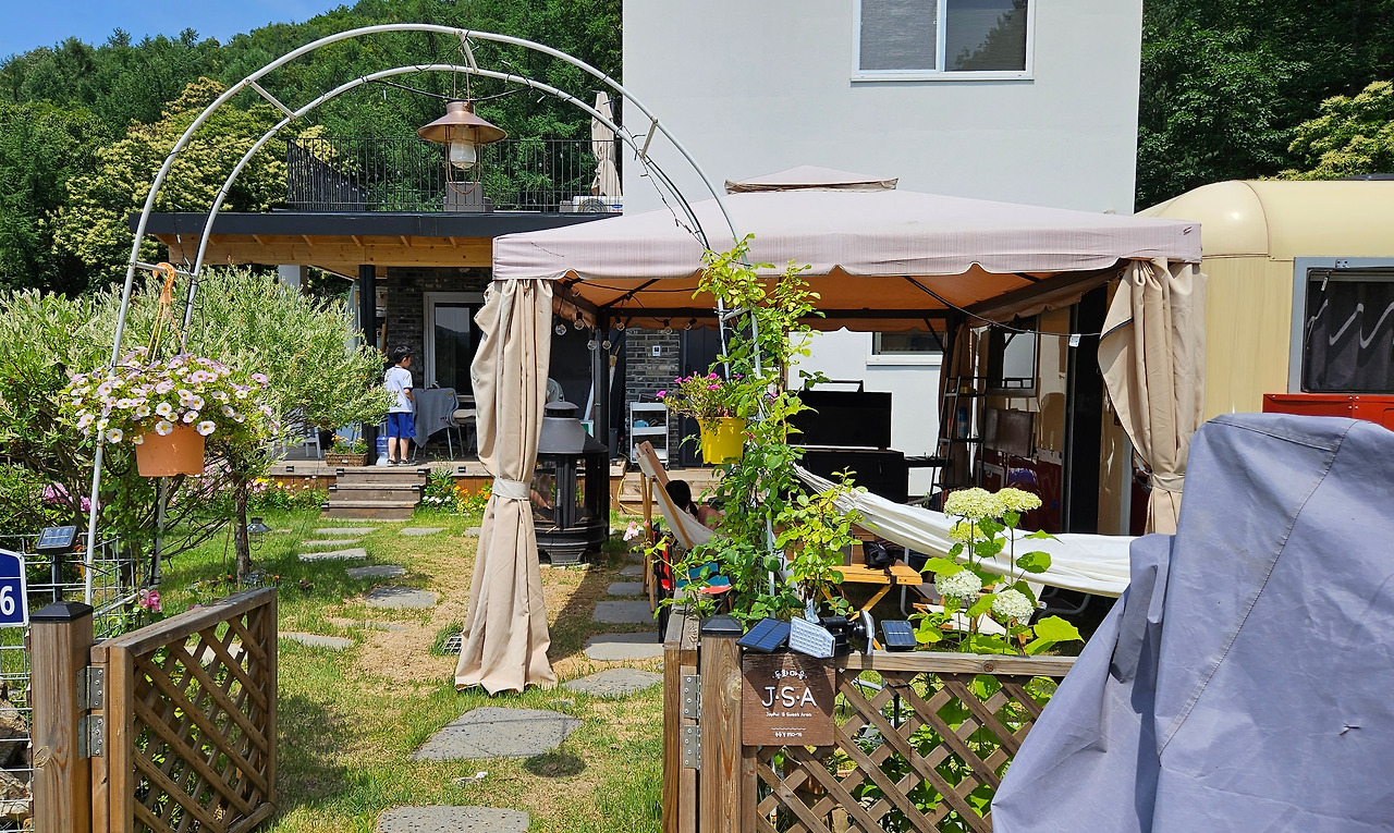 정원에는 카라반과 캠핑 의자, 테이블이 놓여있어 작은 캠핑장을 방문한 것 같았다.