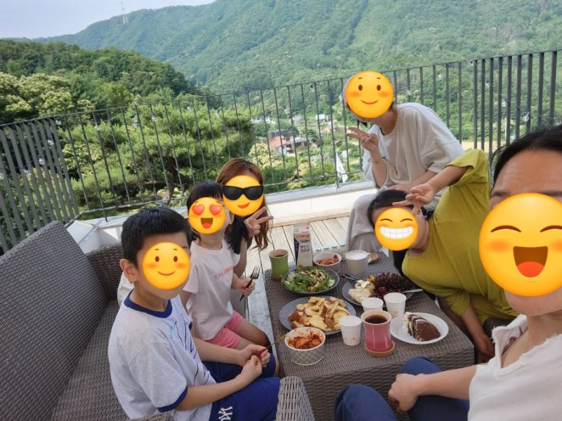 다음날 아침은 옥상 테라스에서 다 같이 아침식사를 하며 사진을 찍었다.