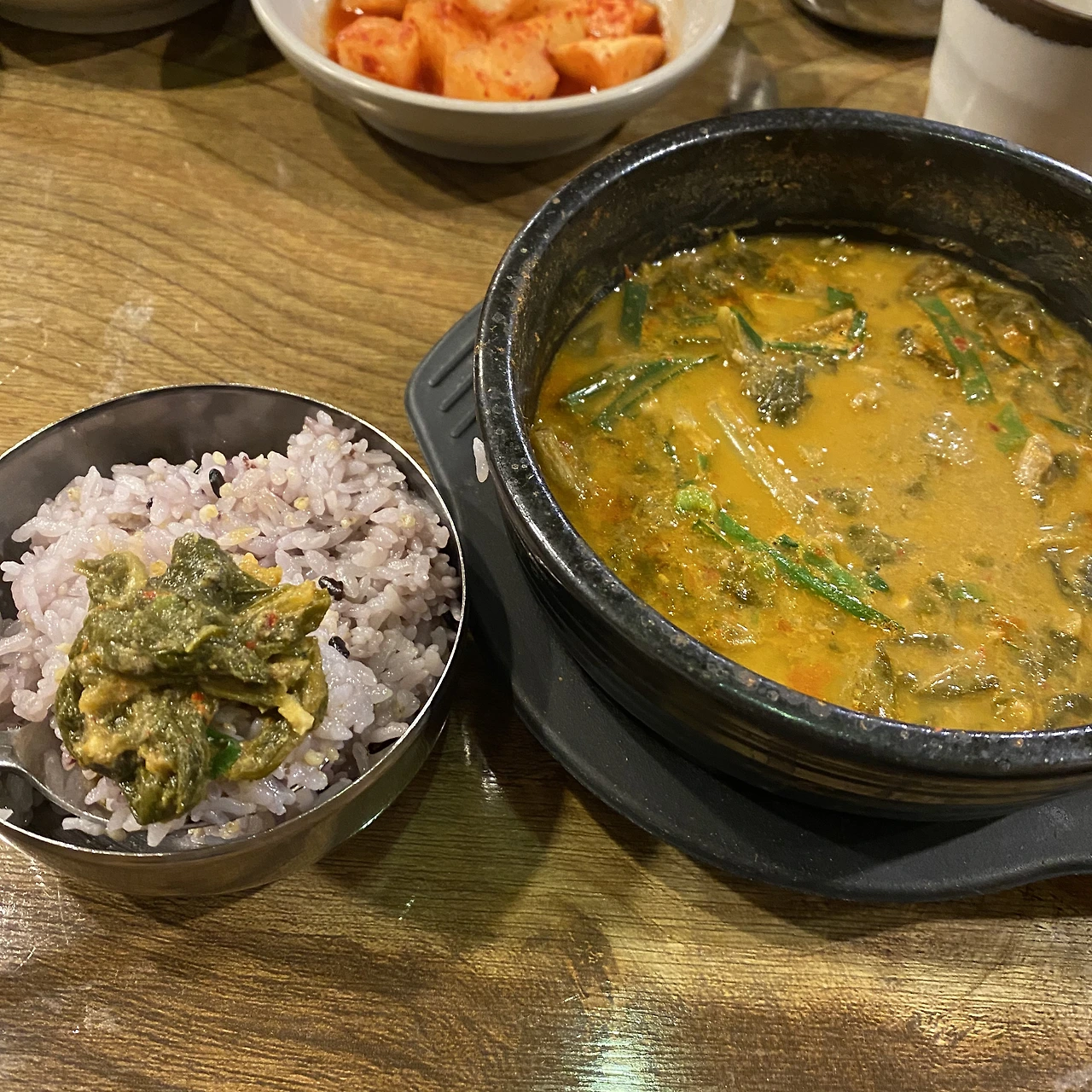 4. 마지막 밥이 1/3 정도 남았을 때, 남은 국물에 밥을 만다. 이때는 밥도 충분히 식었고 뚝배기 안의 국물도 많이 식어있는 상태라 빠르게 먹을 수 있다. 김치와 밑반찬을 함께 곁들여 먹어도 좋다.