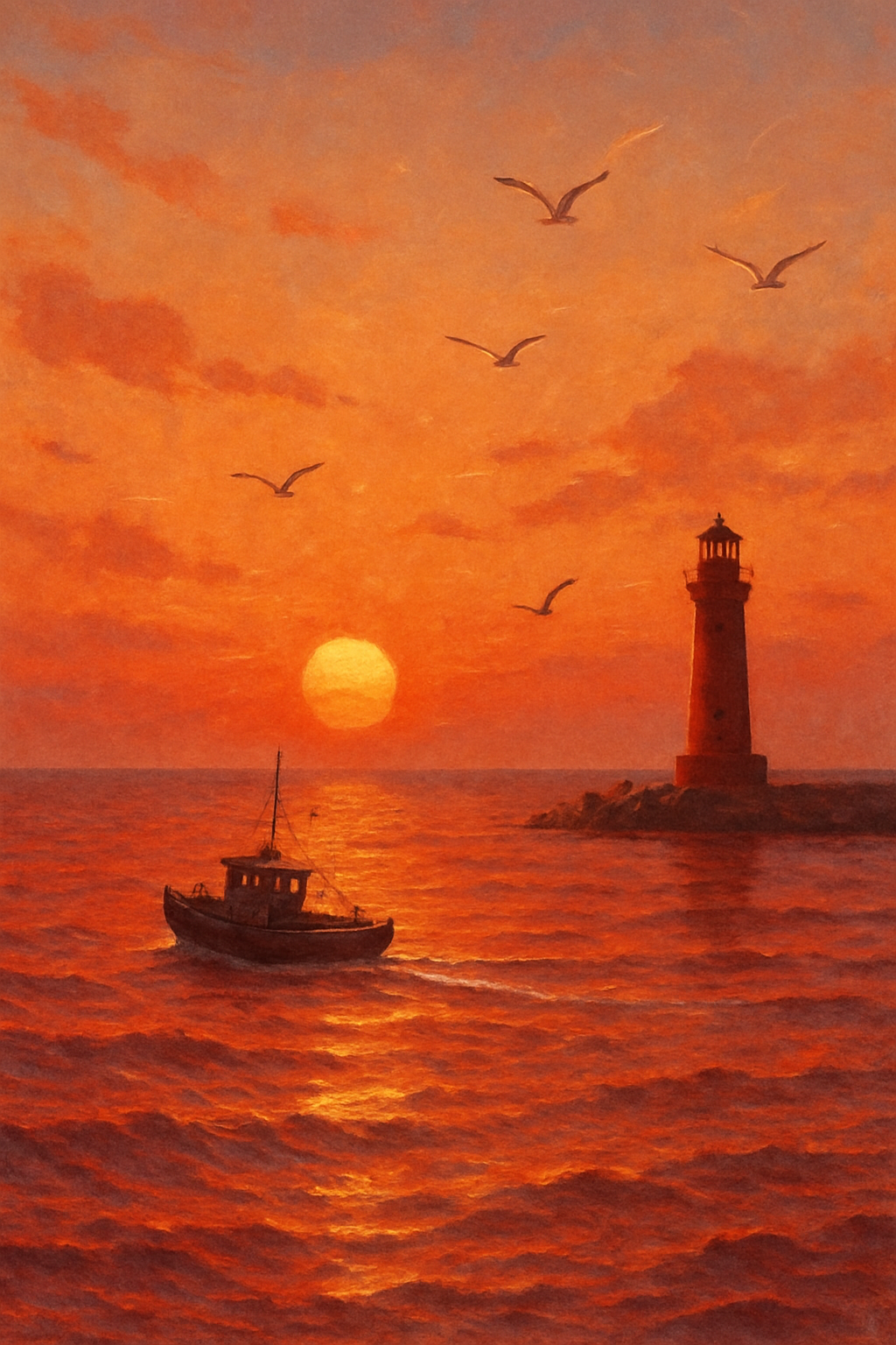 노을지는 물결위에 작은 배가 통통거리며 떠다니는 풍경이