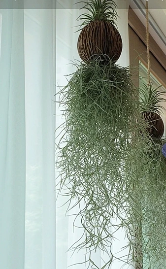 <틸란드시아> -파인애플과에 속하는 착생 현화식물 -공중에서 잎을 통해 먼지와 수분, 영양분을 흡수함 (습도가 높은 곳에서도 잘 자람) -온도는 그리 중요하지 않은 편(수염 틸란드시아는 -10도인 곳에서 자라기도 함) -이오난사는 잎이 붉게 변하면 꽃을 피움 -수염 틸란드시아는 프랑스 어느 지역에선 '할아버지의 수염grandpa beard'이라고도 불림.