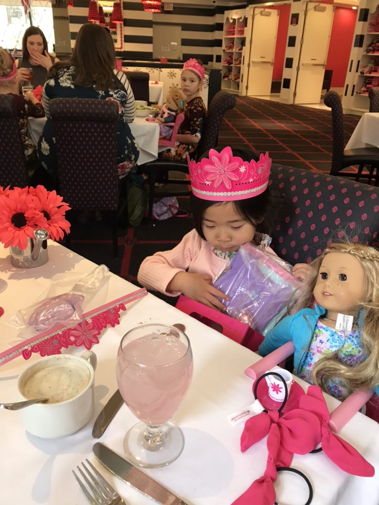 생일을 맞은 아이는 왕관 같은 작은 선물이 든 가방을 받고, 자기 인형과 나란히 앉아서 식사를 할 수 있지요. American Girl Place 인형이 없는 아이는 입구에 전시되어있는 다양한 인형 중에 하나를 고를 수 있어요. 테이블에는 인형을 앉히는 의자와 인형을 위한 앙증맞은 접시와 머그컵도 세팅이 되어있어요. 음식은 3코스 메뉴를 고를 수 있는데 마지막엔 선물 상자 모양의 이쁜 생일 케이크도 받을 수 있지요. (이건 아이에겐 비밀인데... 준비를 하나도 안 한 엄마도 한 큐에 해결할 수 있는 종합 셋트 같은 고마운 곳이에요)