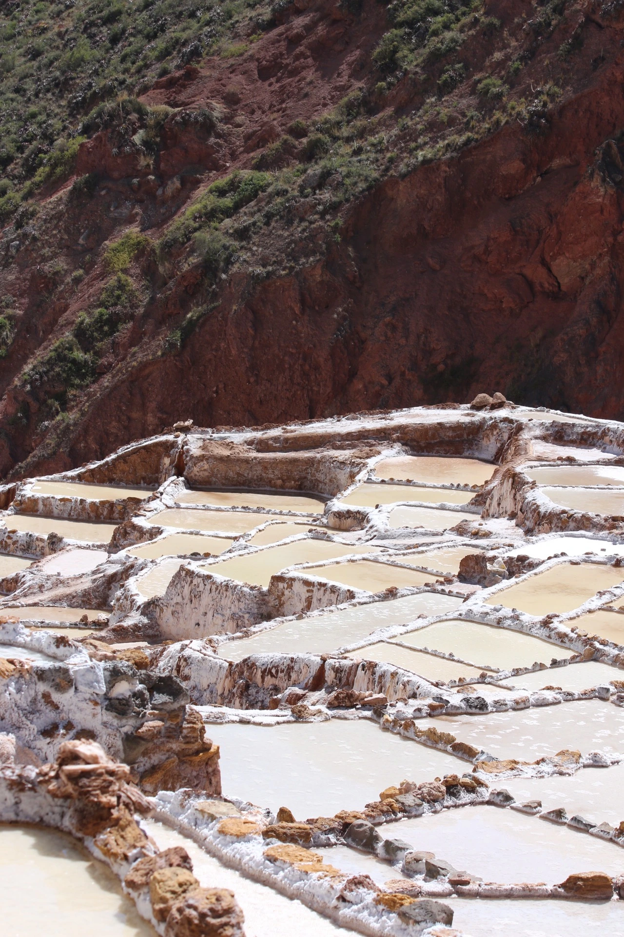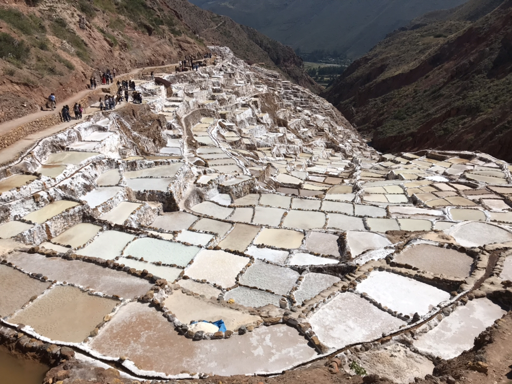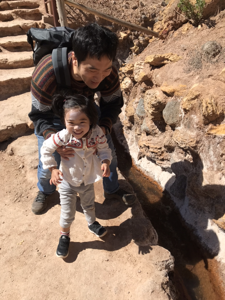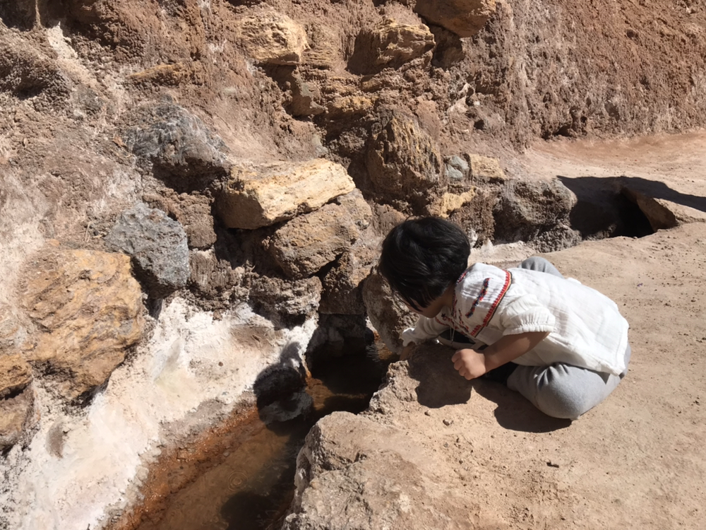 입구를 지나면 이제 계곡처럼 생긴 곳이 나타나는데 그곳이 바로 그림에서만 보던 마라스 염전이다. 구획되어있는 웅덩이마다 뜨거운 태양빛을 하루 종일 내리쬐면서 염전마다 각자 다른 색감의 하얀색 소금을 만들어내고 있었다. 산 위에 어떻게 이런 하얀 염전이 있는지 한참을 들여다봐도 신기했다. 잉카 문명 이전 시대부터 이 곳에 살던 사람들은 안데스 산맥의 어딘가에서부터 흘러나오고 있는 물이 미네랄이 듬뿍 들어있는 짠 물이라는 것을 알게 되고 이것을 이용해 소금을 만들기 시작했다고 가이드는 설명해줬다. 실제로 염전 옆에 산에서 흘러나오는 개울물이 있어 찍어먹어 보니 따끈한 소금 맛 물이었다. 아이도 신기한지 계속 찍어먹어 보면서 "에구, 짜!"했다. 바다 염전보다 이 수상한 안데스 소금밭을 먼저 만나본 아이는 어쩌면 소금은 산에서 나는 것이라고 생각할 수 있겠구나 싶었다. 뭐, 틀린 건 아니니.