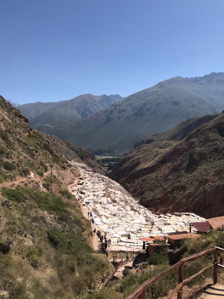 우린 가이드 설명을 들으면서 아침부터 몇 군데 관광지를 둘러보았다. 지금은 가톨릭 성당으로 쓰이고 있는 잉카인들의 무지개 신전, 직물 공방 등을 둘러본 후, 차는 내가 페루에서 두 번째로 가보고 싶었던 그곳, 마라스로 향했다. 마라스는 안데스 산 위에 있는 소금밭이다. 소금은 바다 염전에서만 나는 것이라고 생각했던 나는 산 위에서 어떻게 소금이 만들어질 수 있는지 정말 궁금했고 그걸 내 눈으로 보고 싶었다. 알프스를 닮은 너른 산 위 평지를 한참 달리니 드디어 마라스 간판이 나왔다. 이 곳은 다른 페루 관광지처럼 정부 소유가 아니라 개인 소유의 땅이기 때문에 관광객들은 입구에서 입장권을 끊고 들어갈 수 있었다.