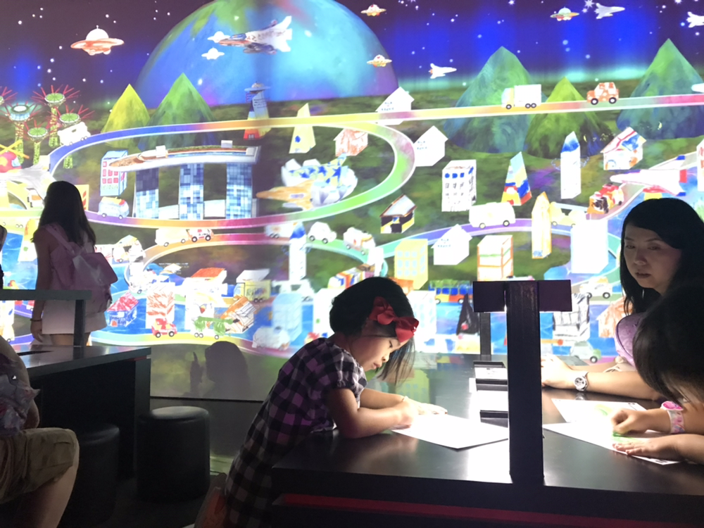 사실 미술관이라고 생각하고 갔는데 여기는 미술을 접목한 과학박물관에 좀 더 가까웠다. 지금은 한시적으로 Future World라는 전시를 하고 있었는데 아이들이 미디어 아트를 이용해서 직접 전시를 체험할 수 있도록 꾸며져 있었다. 아이들은 방 안 가득 흩날리는 꽃 사이를 뛰어다니며 가상의 나비를 잡고, 세차게 내려치는 폭포 아래 들어가기도 한다. 미끄럼틀을 타고 내려오며 풍선을 터뜨리기도 하고, 비행기 그림을 그리면 실제로 한쪽 벽면에 아이가 그린 비행기가 하늘을 날기도 한다. 물론 다 가상 속에서 말이다.