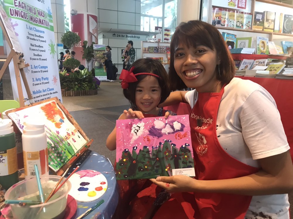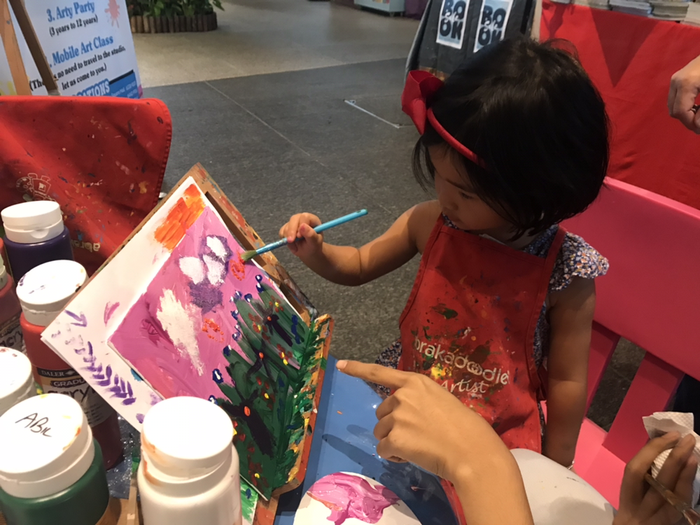 사실 이 날의 수확은 따로 있었다. 어린이 책 축제 기간인 만큼 도서관 앞에서는 여러 어린이 프로그램 홍보 부스가 차려졌는데 Abrakadoodle이라는 어린이 미술 프로그램도 그중의 하나였다. 마침 선생님과 일대일로 미술 수업을 해볼 수 있는 기회가 있었는데 딱히 오후에 할 일도 없었기 때문에 우리는 그 수업에 참여하기로 했다. 워낙 그림 그리는 걸 좋아하는 아이라 미국에 있을 때도 일주일에 한 번씩 미술 수업을 다녔는데 사실 미국의 3세 아이 미술 교육은 색칠 공부에 가까웠다. 여기에서 정식 캔버스에 앞치마를 두르고 유화 스타일(사실은 아크릴 물감)의 작품 하나를 선생님과 그려내니 아이는 신이 났다. 잠깐이지만 싱가포르에 와서 처음으로 30분의 자유시간을 얻은 나도 덩달아 신이 났다. 센터 위치를 확인해보니 마침 우리가 다음 주부터 머무를 오챠드 로드에 있는 곳이라 우린 고민 없이 남은 싱가포르 생활 2주 치의 미술 학원을 등록했다. 아이에겐 아시아로의 역유학이다.