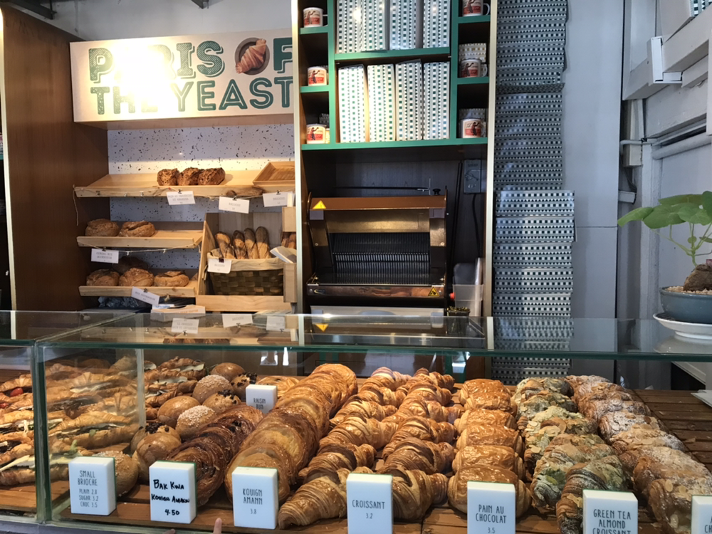 요즘 워낙 인기 있는 곳이라고 해서 사실 인스타에 올릴 사진을 찍는 관광객들로 북적일 줄 알았는데 생각보다 동네는 많이 한산했다. 이 곳이 맞나,라고 생각이 들 정도로 주위를 두리번 거리니, 우리의 첫 번째 목적지 티옹 바루 베이커리가 눈에 들어왔다. 코너에 있는 작은 초록색 인테리어의 빵집인데, 이 곳이 바로 오늘의 티옹바루를 유명하게 만들어준 일등공신이다. 소문대로 가게 안에는 2시간마다 갓 구워지는 크루아상의 버터향이 가득했다. 밀가루와 버터 모두 프랑스에서 공수를 한다고 쓰여있었다. 이 곳에서 나는 크루아상과 진한 블랙커피, 아이는 설탕이 묻은 패스츄리와 오렌지 주스 하나씩을 주문했다. 사실 오전에 아이와 시내에서 한 시간 떨어진 외곽 지역에 있는 과학박물관까지 어렵게 갔다가 너무 재미없어서 금방 돌아와 몸도 마음도 지쳐있는 상황이었는데 입에 넣을 때는 바스락, 입 안에서는 사르르 녹아내리는 크루아상을 먹고 나니 에너지가 다시 백 프로 충전이 되었다.