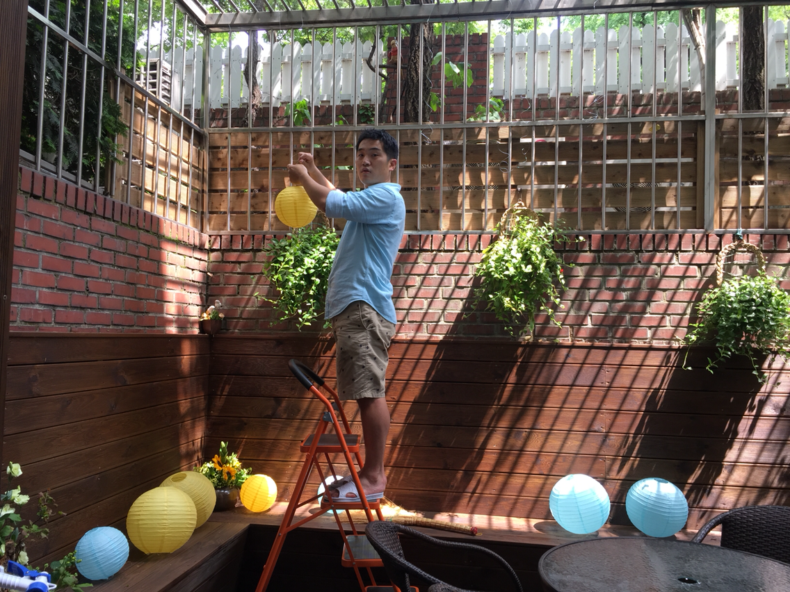 야외 베란다에는 아기 느낌과 잘 어울리는 분위기로 꾸몄다. 하늘색과 병아리 노란색을 메인 컬러로 천장에 페이퍼 볼을 다니 한층 파티 분위기가 났다. 아침부터 아빠랑 남편이 올라가서 열심히 꾸몄다. 여자아이니까 분홍색으로 할까 살짝 고민하다가 너무 식상할 것 같아 윤서의 이미지에 어울리는 색으로 조합했다. 인터넷에서 산 종이 공 몇 개 달아놨을 뿐인데, 썰렁했던 지하실 분위기가 한층 부드러워졌다.