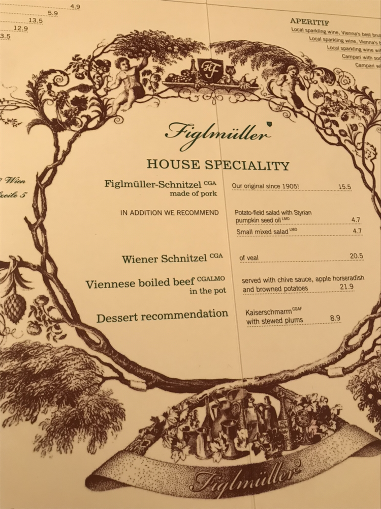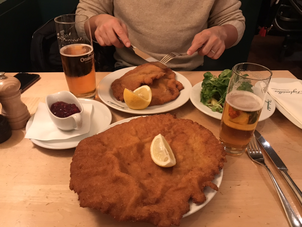 우선, 우리는 비엔나에서 가장 오래되고 맛있는 슈니첼(한국의 얇은 남산 돈가스와 비슷하게 생긴 독일 음식)을 판다는 Figlmuller란 식당에 갔단다. 아빠는 고기를 정말 좋아하는데(특히 돼지고기), 윤서도 아빠를 닮아 고기를 좋아하니 분명 이 곳을 좋아할 거야. (아빠는 요즘 윤서를 육식 공룡이라고 부른단다. 넌 지금 좀 마른 편인데 야채는 별로 안 좋아하지만 고기를 입어 넣어주면 어른 1인분을 다 먹을 때도 있지!) 엄마는 치킨으로 만든 슈니첼을 먹어보고 싶었는데, 아빠가 그런 메뉴를 시키는 사람은 없다고 고집을 부려서 돼지고기 슈니첼 1인분, veal 슈니첼 1인분, 그리고 샐러드 하나를 시켜서 나눠 먹었단다. 그런데 정말 아빠 말이 맞았어! 아빠가 시킨 veal 슈니첼이 제일 맛있어서 엄마랑 아빠랑 메뉴를 바꿔 먹었단다. 엄마는 항상 엄마가 시킨 메뉴가 실패한 것 같으면 조용히 아빠와 접시를 바꾸는데 그럴 때마다 아빠는 고맙게도 아무 소리도 안 하고 엄마가 시킨 메뉴를 싹싹 비워준단다.