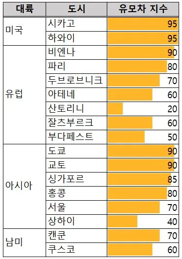 지난 3년 동안 아이와 함께 유모차를 끌고 다녔던 도시들의 유모차 지수를 한 번 만들어보았다. 물론, 내가 간 곳들이 그 도시 전체를 대표한다고 할 수는 없지만, 적어도 한 도시에 일주일 정도는 머물면서 이곳저곳을 다녀본 체감의 결과다. 보다 정확하게 하기 위해서 함께 여행했던 남편과 각각 점수를 매겨 둘의 평균치를 내봤다.