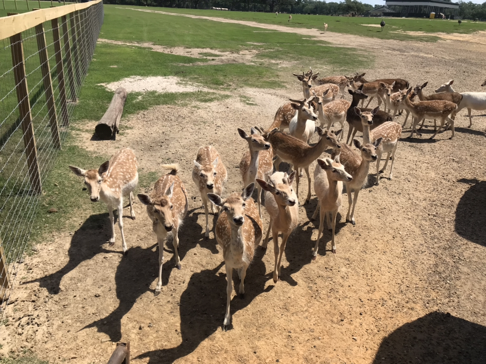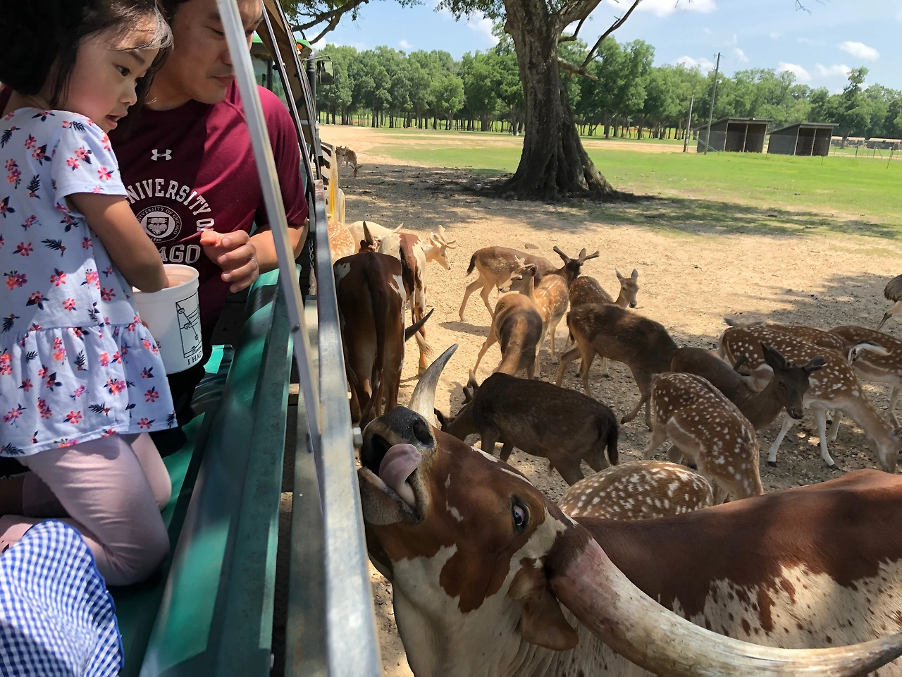 이 투어의 하이라이트로 기린이 사는 곳도 갔었는데, 아쉽게도 이 전에 지나간 웨건에서 간식을 충분히 먹은 모양인지 나무 그늘 밑에 들어가서 나올 생각을 안 하더라고요. 그래서 멀리서만 기린을 보는 것으로 만족해야 했습니다. 동물원이나 디즈니월드에 있는 사파리에 비하면 동물들 종류도 초식 동물에 한정되어있어 다양하지는 않지만, 아이들이 그냥 보고 쓰윽 지나가는 것이 아니라, 동물들과 직접 동물들과 교감을 할 수 있다는 점이 이 곳의 장점인 것 같아요.