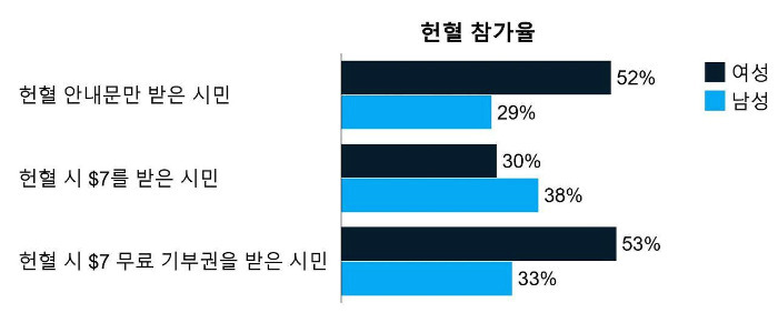 포지티브 인센티브에서도 의도치 않은 부작용이 발생하는 것을 볼 수 있었다. 여성의 경우 금전적 인센티브를 받은 그룹의 헌혈 참가율이 가장 저조했는데, 헌혈에 인센티브를 제공하고 금전적 가격표를 붙이는 순간, 순수한 도덕적 가치와 만족도를 억제하는 부작용을 낸 것이다. 반면 남성의 경우 금전적 인센티브가 헌혈 참가율을 약 10% 끌어올리는 효과를 냈다. 성별에 따라서도 인센티브가 미치는 영향이 다른 것이다.