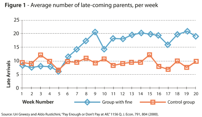 경제학자 Uri Gneezy와 Aldo Rustichini는 2000년에 '벌금은 가격표 (A Fine is a Price)'라는 연구결과를 발표했다. 사실 이건 완전 나의 이야기였다. 이들은 데이케어들로부터 협조를 받아 '지각 시 벌금' 제도의 효과를 테스트했다. 일반적인 경제, 경영학 논리에 따르면 벌금 제도는 지각을 억제하는 인센티브로 작용하여, 벌금 제도가 시행된 데이케어의 부모 지각률이 감소해야 했다. 그런데 실험 결과, 반전이 일어났다. 평상시와 동일하게 벌금 제도 없이 운영되던 데이케어들에선 10%대의 지각률을 관찰한 반면, 벌금 제도를 도입한 데이케어들에선 부모 지각률이 2배로 급증하여 20%대로 치솟는 현상이 일어난 것이다. 왜일까? 내가 만약 이 수업을 아이가 없는 총각 시절에 들었다면 진짜 궁금했을텐데, 난 이 경제학자들의 실험 결과를 보고 '그럼, 그럼' 고개가 끄덕여졌다. 전형적인 채찍의 부작용이다.