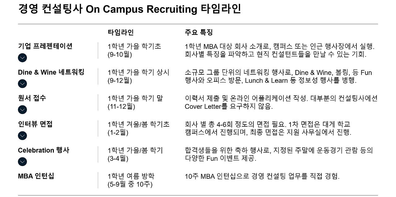 MBA를 현실 도피를 위한 2년 간의 달콤한 휴가라고 생각한다면 크게 실망할 것이다. 졸업하면 자동으로 돌아갈 안정적인 회사나 패밀리 비즈니스가 있는 게 아니라면 모를까. MBA 학생들에게는 크게 2번의 취업 기회가 있는데 그중 하나가 1학년 여름 방학에 일할 섬머 인턴 자리, 그리고 졸업을 앞두고 진행하는 정규직 자리다. 이 중, MBA 학생들에겐 여름 인턴십 리크루팅이 메인이 된다. 대부분의 회사들은 섬머 인턴 선발을 통해 미리 예비 신입 사원들을 확보하고 있기 때문이다.