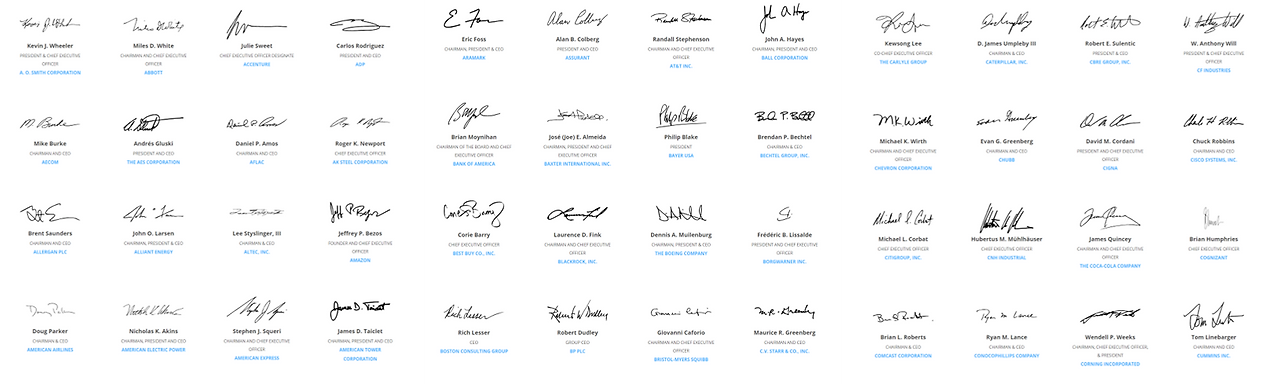 그런데 2019년 8월, 미국의 주요 CEO들은 이러한 주주 중심의 경영 철학을 대체할 만한 새로운 경영 패러다임 '스테이크홀더 (stakeholder)' 중심의 경영을 채택하기 시작했다. 이들은 기업의 존재 목적을 재정의하며, 주주만을 위한 경영이 아닌 모든 스테이크홀더(고객, 임직원, 서플라이어, 사회 전반, 그리고 주주)의 가치를 집약적으로 고려하여 의사결정을 내리는 경영철학을 도입하기로 선언한 것이다. PR 홍보활동이 아니냐는 부정론자들도 있겠지만, 그렇지만은 않다. 해당 선언문을 채택한 7,000조 원 ($6.9 Trillion) 규모의 세계 최대 자산운용사 BlackRock의 CEO Larry Finks는 대주주로 경영에 참여하고 있는 기업들에 공개 편지를 보낸다. 그리고 편지에 "기후변화 리스크는 투자 리스크다 (Climate Risk Is Investment Risk)" 등 단기적인 수익만이 아닌 중장기적인 사회 전반의 영향을 고려해줄 것을 기업의 대주주로서 호소한 것이다.