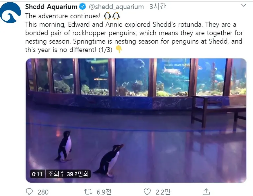 오늘 받았던 소식 중에서 재밌는 뉴스가 있었습니다. 바로 시카고의 대표적인 수족관인 쉐드 아쿠아리움(Shedd Aquarium)에서 도착한 소식이었지요. 미국의 거의 모든 다른 박물관들처럼 이곳도 이번 주부터 장기간 휴장에 들어가는데요, 수족관이 텅 빈 이 시기를 활용해 이 곳에 살고 있는 펭귄 커플, Edward와 Annie에게 수족관 전체(심지어 직원들 오피스까지!)를 돌아다니며 데이트를 할 수 있게 해 준다는 것이지요. 펭귄들은 봄이 되면 집을 짓고, 알을 낳는 Nesting season이 되는데 이 시기면 항상 커플 둘이 사이좋게 꼭 붙어다니거든요. 그리고 다음 주에는 아쿠아리움 팬들이라면 누구나 온라인으로 이 펭귄들의 재밌는 수족관 데이트를 구경할 수 있도록 하겠다고 했습니다. 마치 예전 영화 '박물관이 살아있다!'처럼 흥미로운 이야기가 펼쳐질 것 같아요. 사람들이 아무도 없는 수족관에서 펭귄 커플은 어떤 데이트를 즐길지!