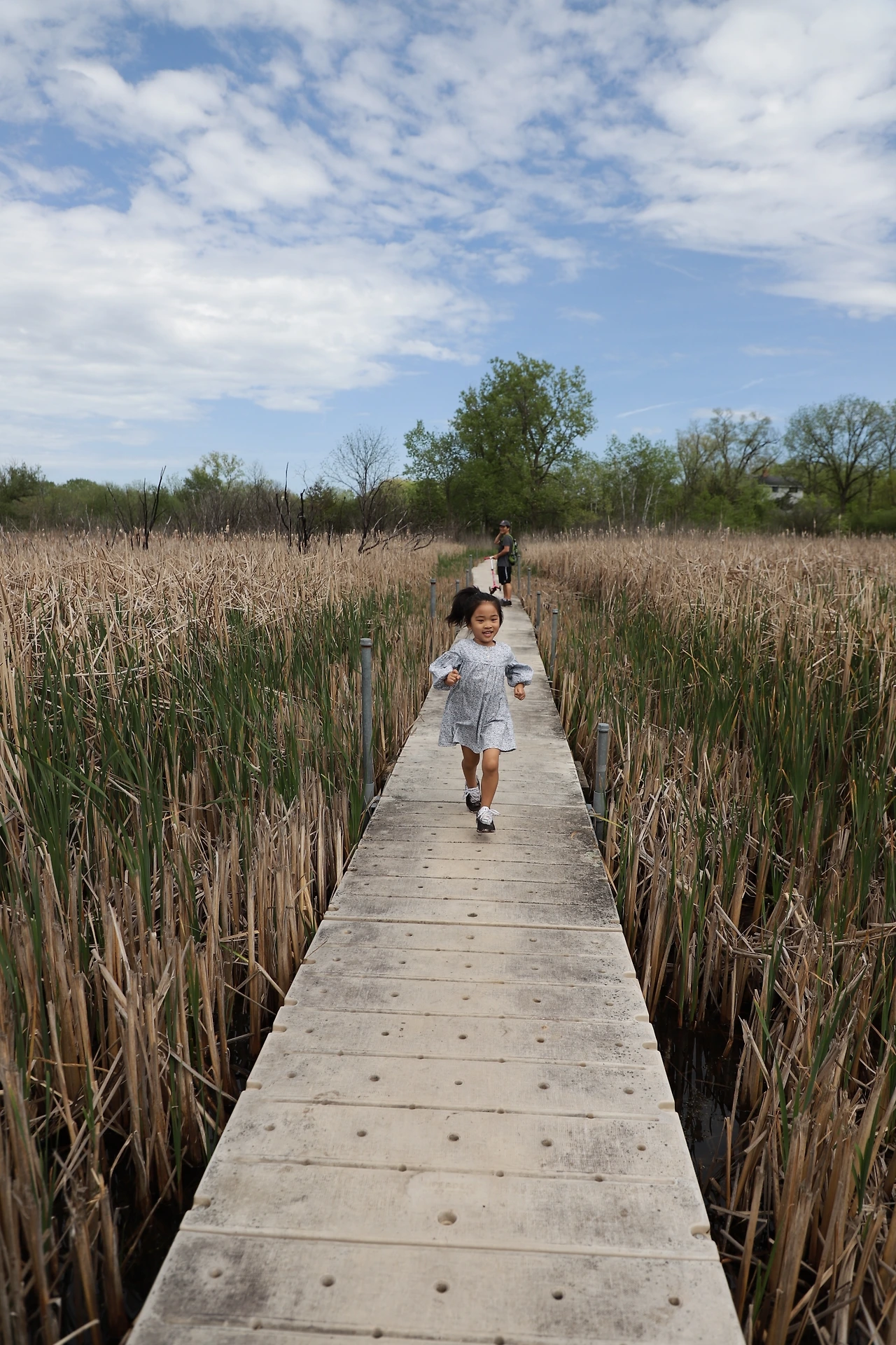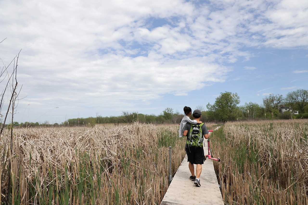 우린 숲이 처음이니 아이와 함께 걷기 너무 어렵지 않고 숲이 깊지 않은 곳을 가보기로 했어요. 못 빠져나올 수도 있으니까요! 우선 몇 군데 후보 중에서 뭔가 믿음직스럽게 State 이름 붙은 곳을 가보기로 했습니다. 시카고 다운타운에서 북쪽으로 1시간 정도 가면 나오는 Volo Bog State Natural Area가 우리의 첫 숲 여행지였죠. 원래는 4월까지만 해도 숲 입구에 아예 차들이 못 들어오게 모두 셧다운이 되어있었는데 조금씩 코로나 상황이 나아지면서 주차장을 오픈했습니다. 하지만 여전히 관리하는 직원들은 아무도 없고 공원 안에 있는 네이처 센터도 모두 문을 닫은 상황이었습니다. 한마디로 들어올 수는 있지만, 모든 리스크는 개인이 안고 들어오란 뜻이었죠. 진짜 가도 되나 조금 겁이 나긴 했지만, 어쨌든 아이를 데리고 여기까지 왔으니 우린 한 번 숲 안으로 들어가 보기로 했습니다.