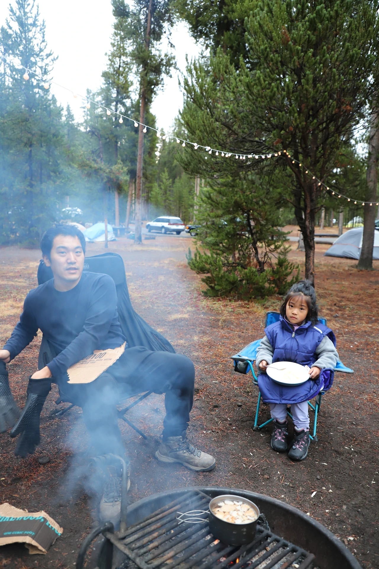 아직 캠핑 초보지만, 그래도 이제 몇 번 해봐서인지 캠핑장에 가면 우리 식구 각자가 자기 역할을 착착착해내요. 남편이 텐트를 칠 땅을 고르고 셋업을 시작하면, 저는 아이스박스와 음식 정리를 하죠. 그동안 아이는 작은 상자를 들고 다니면서 솔방울이나 솔잎들을 모아놔요. 나중에 캠프파이어 불을 지필 때 유용하게 사용되거든요. 옐로스톤 캠핑장의 재밌는 점은 각 사이트마다 Bear Proof 캐비닛이 있다는 점이에요. 곰이 음식을 가져가지 못하도록 사람이 손을 깊숙이 넣어야 탈칵하고 열릴 수 있게끔 만들어졌죠. 그 안에 우리는 가져간 음식들을 잘 정리해두었습니다.
