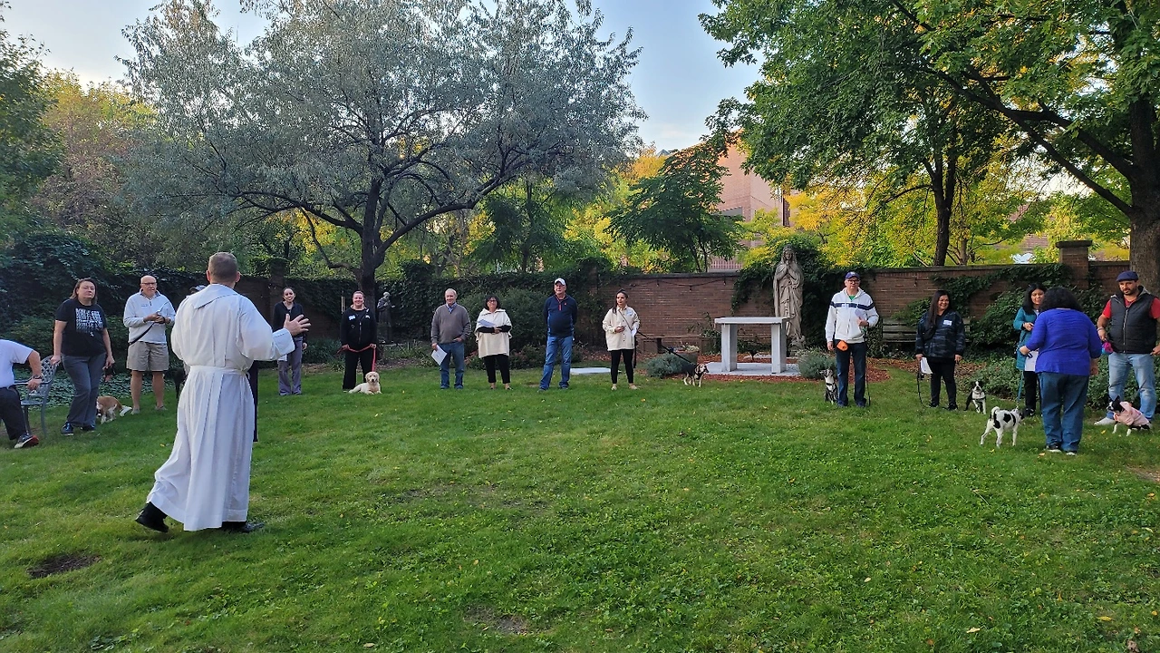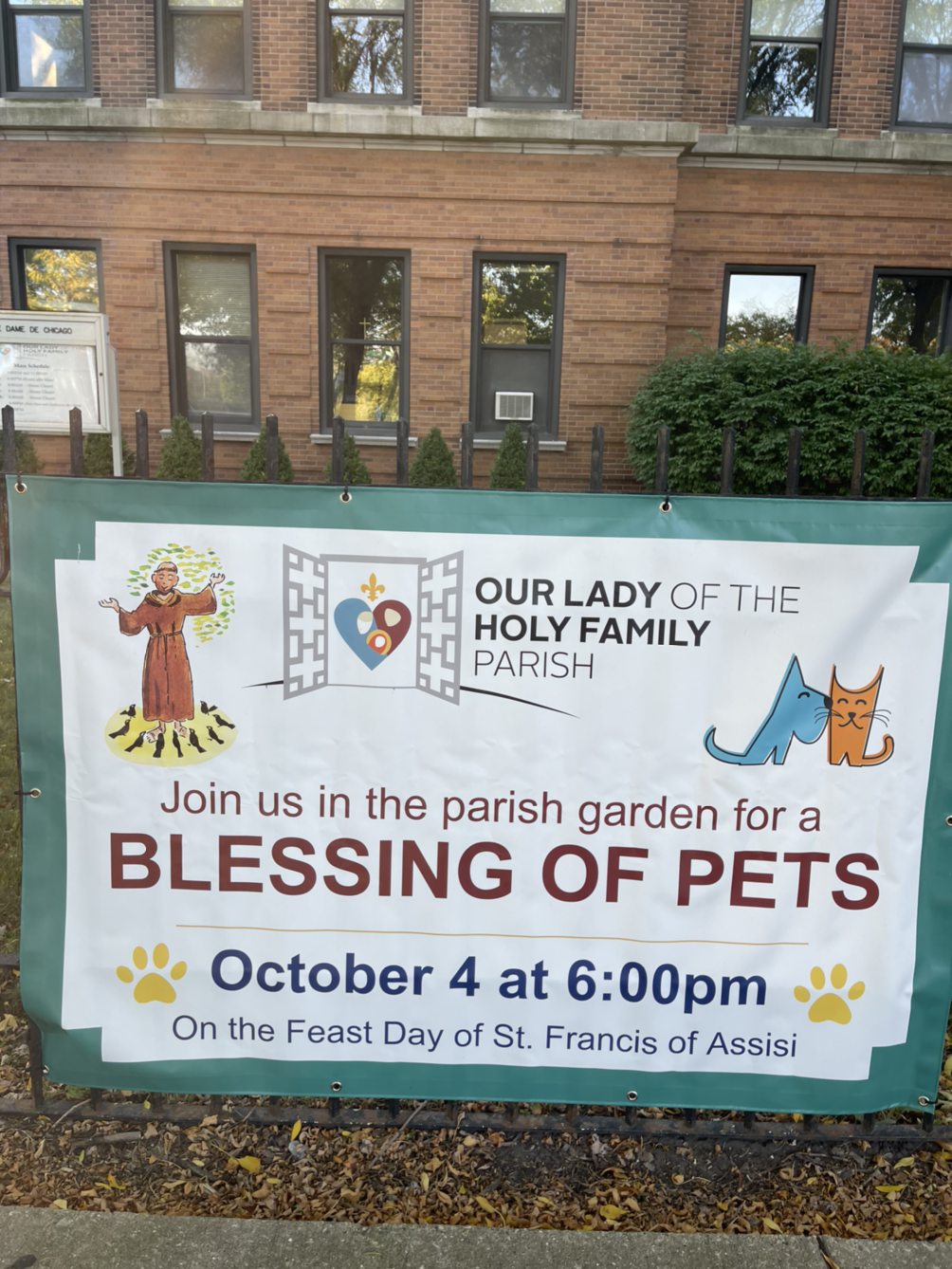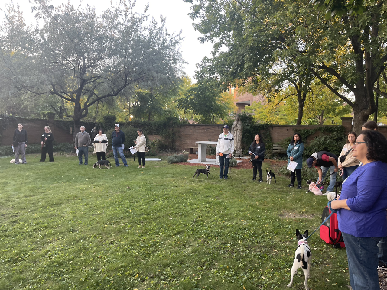 출근 시간 때문에 미사가 끝나자마자 서둘러 나오려는데, 신부님께서 오늘 저녁 6시에 동물과 자연의 수호성인이신, 아시시의 성 프란체스코 축일 기념 Pet Blessing 행사가 성당 마당에서 열릴 예정이라고 안내해주셨습니다. 제가 '저는 Pet이 없는데 아이들과 가도 될까요?' 했더니, '당연하죠. 아이들이 당신의 pet이기도 하니까요!'라고 유쾌하게 대답해주셨죠. 퇴근을 하고 서둘러 아이들을 픽업해서 다시 성당으로 향했습니다. 바스락 거리는 가을 공기와 이제 막 단풍이 들기 시작한 성당 마당에는 이미 강아지들과 그 가족들이 빙 둘러서 미사를 기다리고 있었습니다. 입장할 때 각자 이름표에 강아지 이름과 자기 이름을 쓰는데, 저에게는 아이들 이름을 써주셨죠. 한 스무 가족이 모였나 봐요. 외동견을 키우는 가족도 있고, 강아지와 고양이를 같이 키우는 입양 가족도 있었죠.