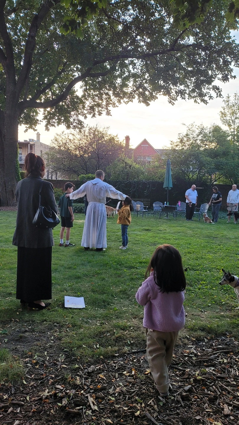 미사가 시작되기 전에 신부님은 저희 첫째에게 오시더니 '오늘 미사에 나를 도와주고 싶니?'라고 물어보셨어요. 행사 참여하는 걸 좋아하는 첫째는 신이 나서 신부님을 따라다니며 옆에서 기도문을 들고 있는 귀여운 역할을 맡았죠. 신부님은 각 강아지 가정 앞에 무릎을 꿇고 축성을 해주셨어요. "이 작은 생명과 그 가족이, 하나님께서 허락하신 시간까지, 서로 함께 기쁘고 행복하기를!" 신기하게도 마당에 모인 수 십 마리의 강아지들은 아무도 짖지도 않고 딱 가족 옆에 앉아서 자기의 차례를 기다렸죠. 지금 다시 생각해도 그 모습은 정말 신기한 광경이었어요!