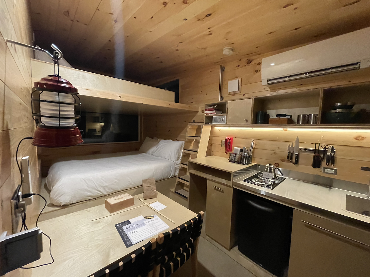 Get Away는 도시 근교의 한적하면서도 풍광이 좋은 곳에 만들어둔 캠핑장이에요. 컨테이너 같이 생긴 아주아주 작은 집 안에는 침대, 부엌, 식탁, 샤워시설, 그리고 모든 식기류, 책, 오디오, 수건, S'more 재료까지 모두 다 준비가 되어있죠. 따뜻한 난방과 물은 물론이고요. 여기의 하이라이트는 한 쪽 면이 유리로 뻥 뚫려 있어요. 그래서 마치 숲 속 야외에서 잠을 자는 것 같은 경험을 할 수 있고, 단풍 질 때나, 눈이 올 때는 환상적인 분위기를 만들어주죠.