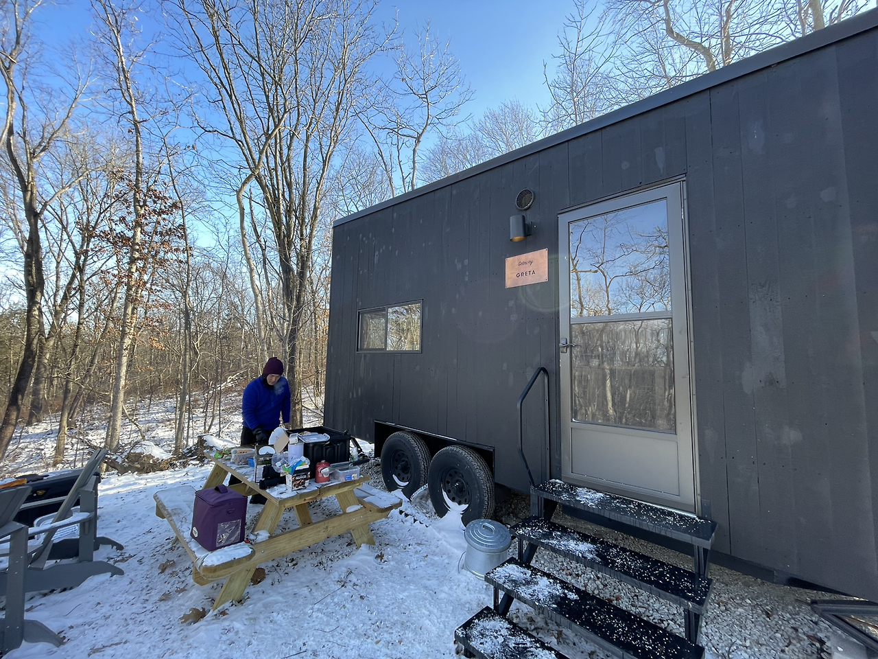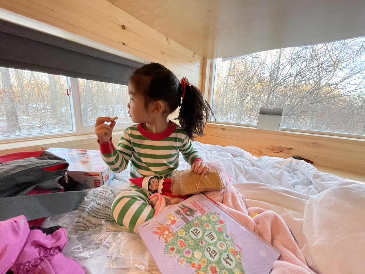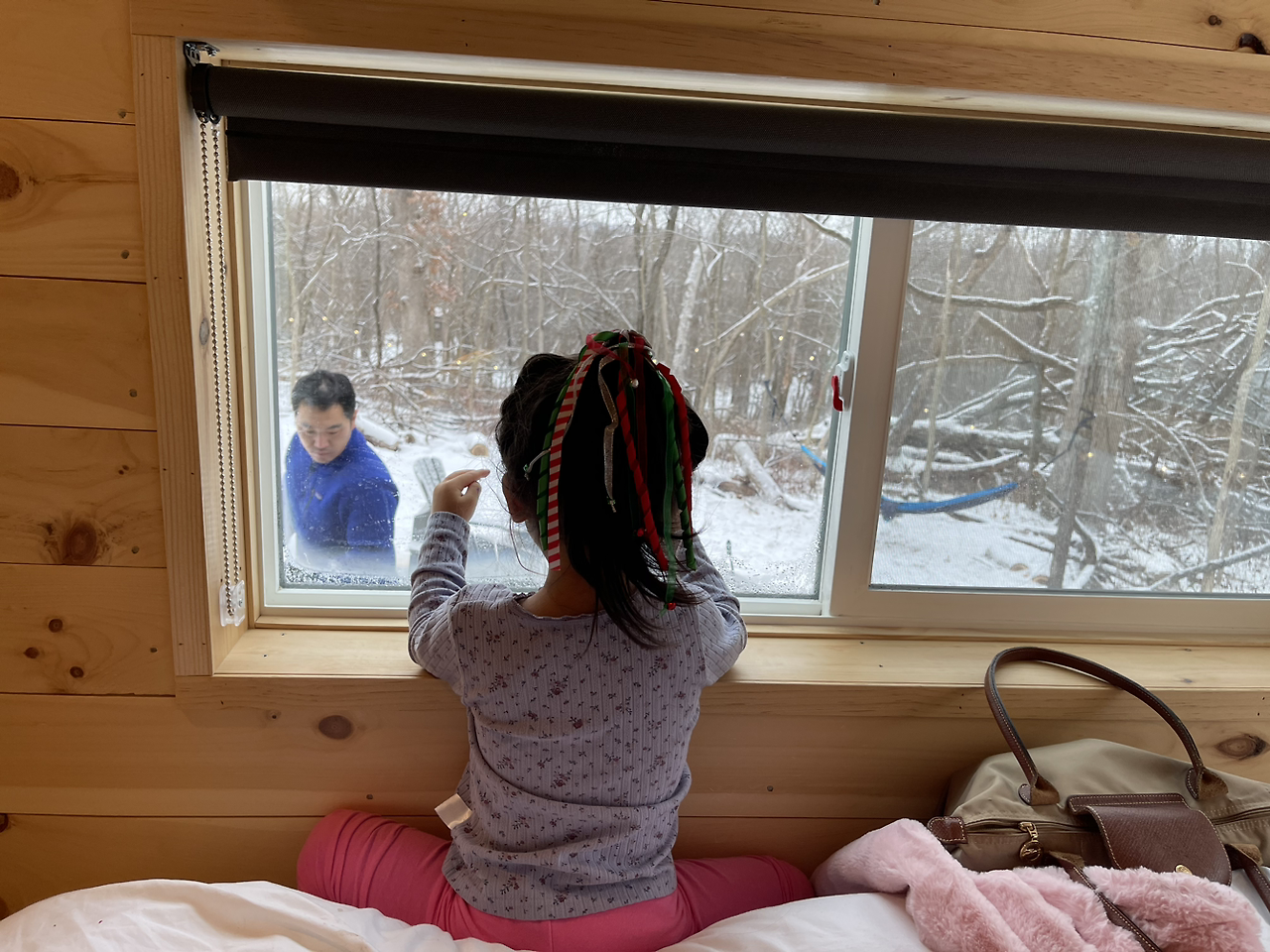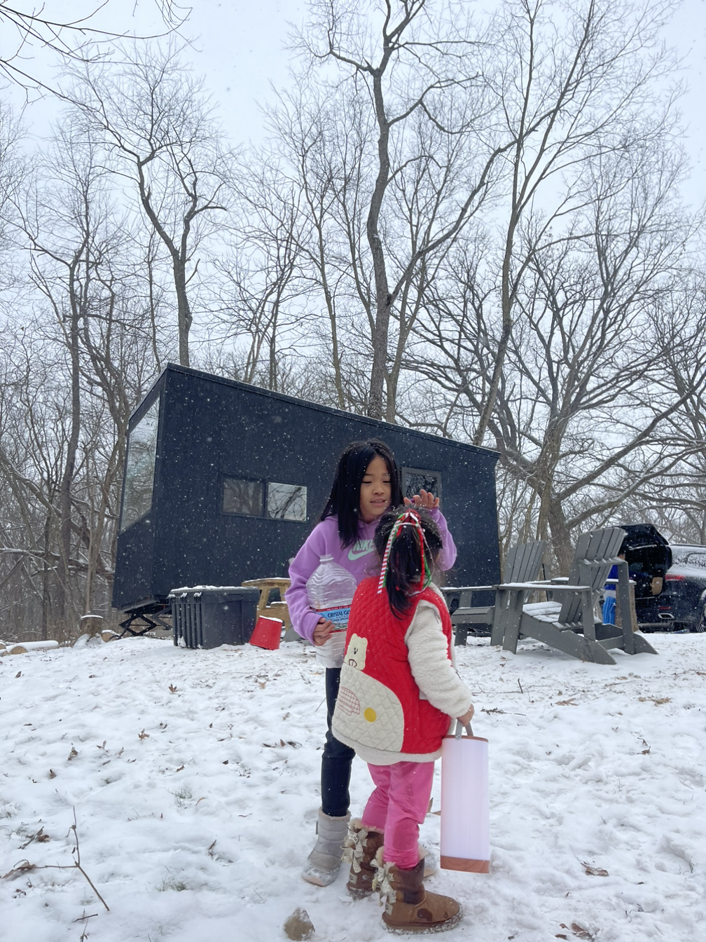 이미 여러 번 캠핑을 해본 적 있는 아이들은, 그 어떤 캠핑장보다 여기가 더 좋다고 했어요. 아무래도 따뜻한 방 침대에서 잘 수 있으니까요. 또 마침 저희가 갔던 크리스마스 연휴는 한국 뉴스에도 나올 만큼 미국에 엄청난 북극 추위가 찾아온 그다음 날이었는데, 정말 춥긴 했지만, 눈이 너무 예쁘게 펑펑 내려서 마치 스노볼 안에 들어온 것만 같았어요. 눈이 펑펑 오는 날, 크리스마스 캐럴 들으며 컨테이너 앞에 있는 캠프 파이어에서 불도 피우고, 마시멜로도 구워 먹으니, 어디 멀리 안 가도 이게 행복이구나, 생각이 들었죠.