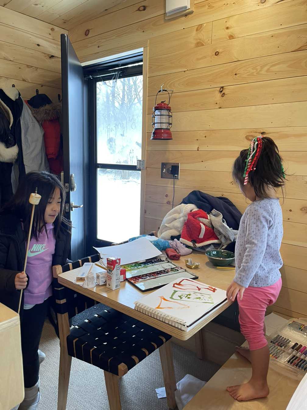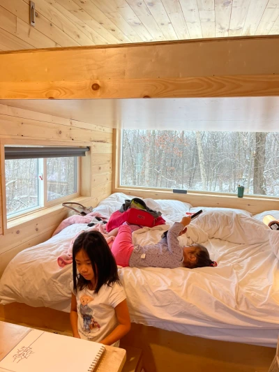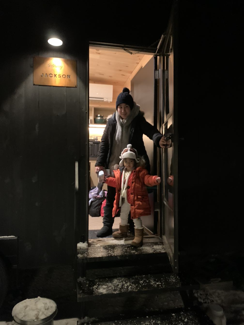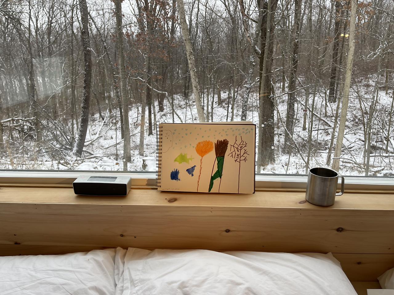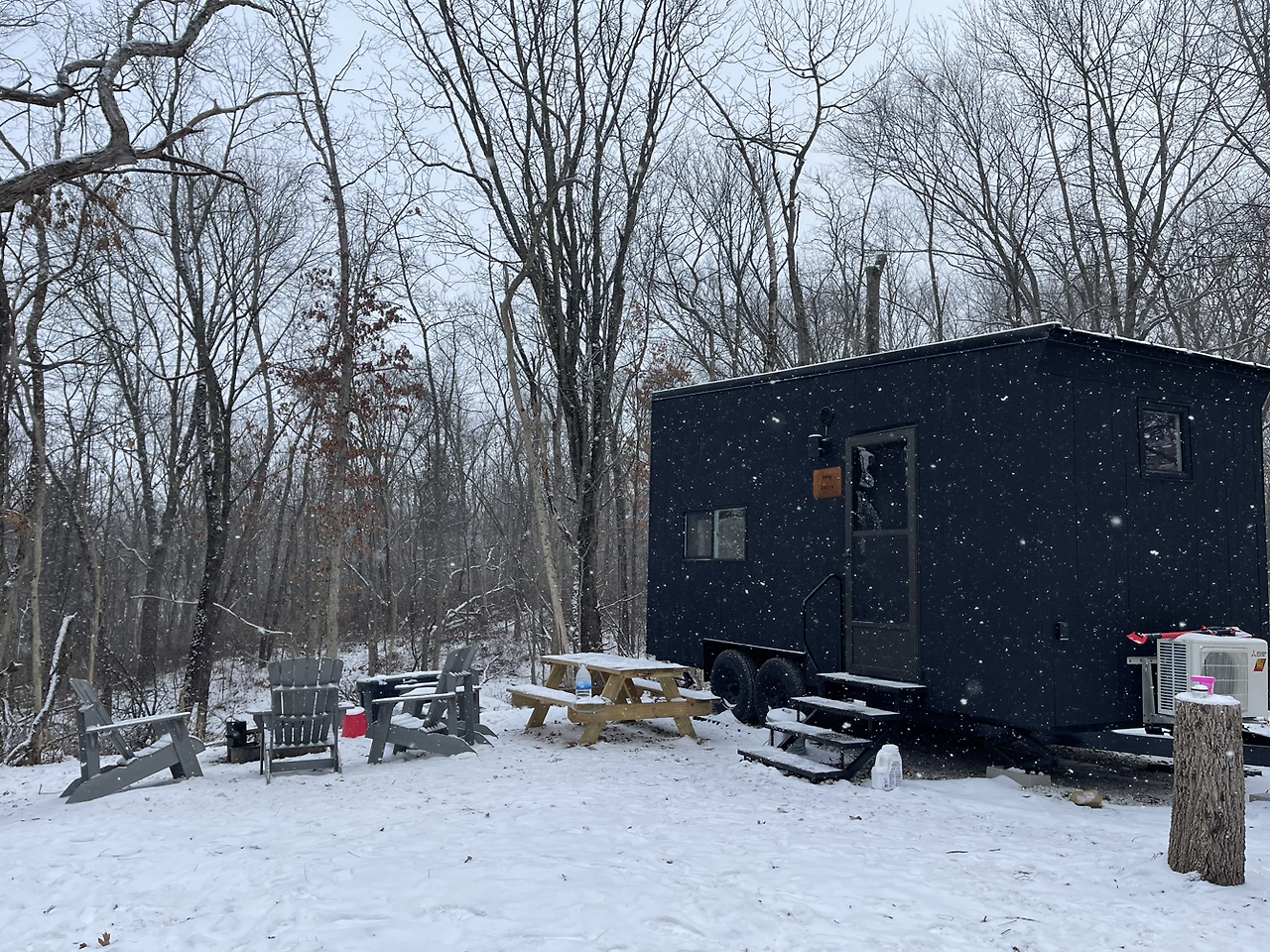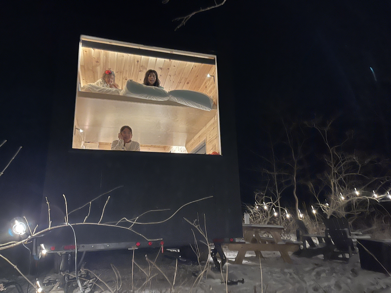 이미 여러 번 캠핑을 해본 적 있는 아이들은, 그 어떤 캠핑장보다 여기가 더 좋다고 했어요. 아무래도 따뜻한 방 침대에서 잘 수 있으니까요. 또 마침 저희가 갔던 크리스마스 연휴는 한국 뉴스에도 나올 만큼 미국에 엄청난 북극 추위가 찾아온 그다음 날이었는데, 정말 춥긴 했지만, 눈이 너무 예쁘게 펑펑 내려서 마치 스노볼 안에 들어온 것만 같았어요. 눈이 펑펑 오는 날, 크리스마스 캐럴 들으며 컨테이너 앞에 있는 캠프 파이어에서 불도 피우고, 마시멜로도 구워 먹으니, 어디 멀리 안 가도 이게 행복이구나, 생각이 들었죠.