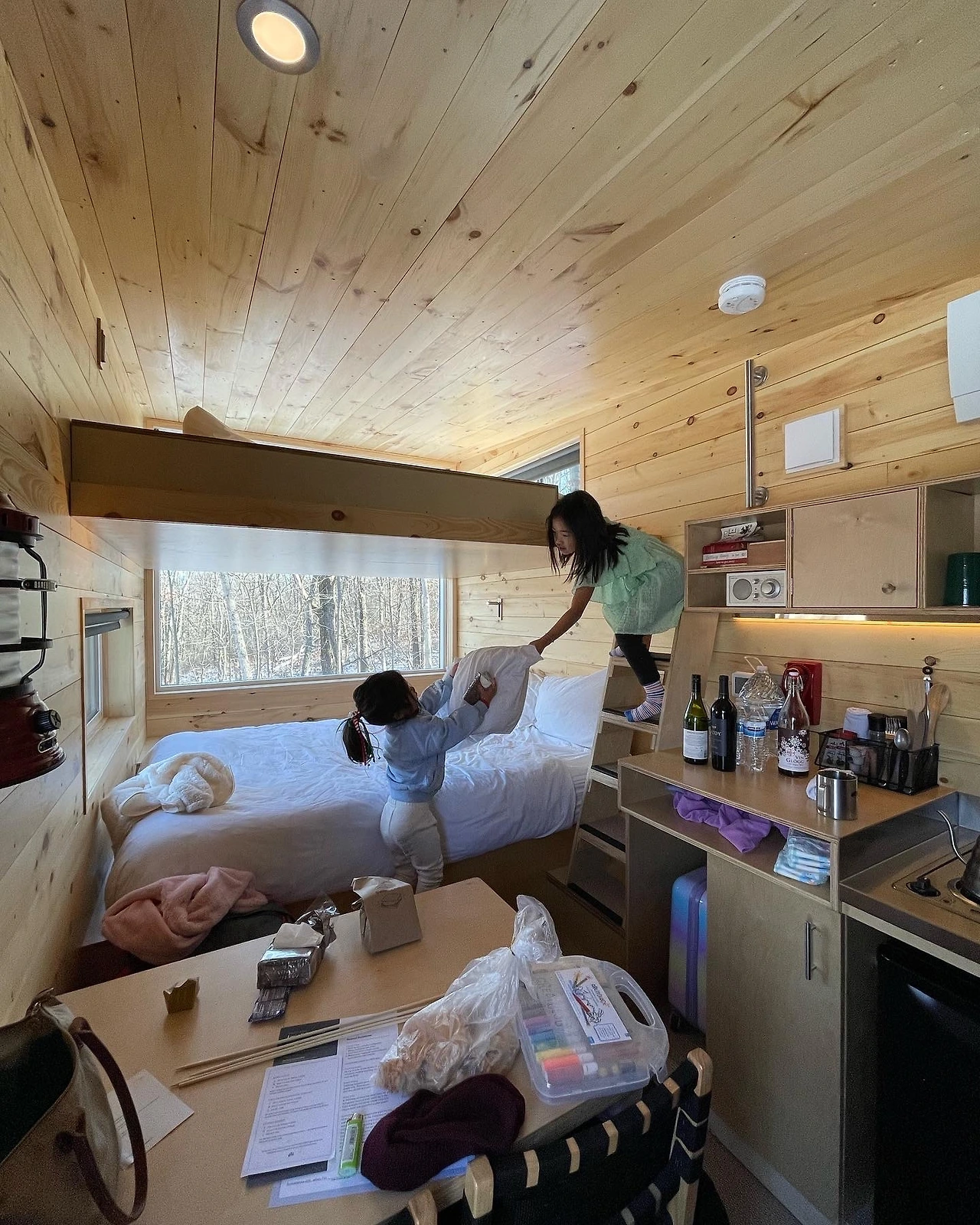 Get Away는 따로 체크인이나 체크아웃을 할 필요가 없어요. 문자로 자세한 안내 사항이 오는데, 비밀 번호를 열고 들어가면 운영자가 미리 저희가 도착하기 전에 방을 따뜻하게 해 두고 불을 다 켜두기 때문에 편안하게 들어갈 수 있죠. 그러니까 이곳에 와서 원한다면, 아무도 마주치지 않을 수 있어요. 컨테이너들은 숲 속 여러 군데 뚝뚝 떨어져 있고 또 서로 안 보이게 잘 위치하고 있어서 프라이빗하게 지낼 수 있죠. 하지만 난방에 문제가 생기거나, 수건이 더 필요하다든가 도움이 필요할 때는 언제든 운영자에게 문자를 보내서 질문을 하거나 호출을 할 수 있어요. 저도 처음 배정받은 방에 문제가 생겨서 문자를 보냈는데 5분도 안돼서 슈퍼우먼처럼 직원이 나타나서 문제를 깔끔하게 해결해 줬답니다. 그러니까 캠핑 초보자도 아무런 걱정 없이 떠날 수 있는 곳이죠.