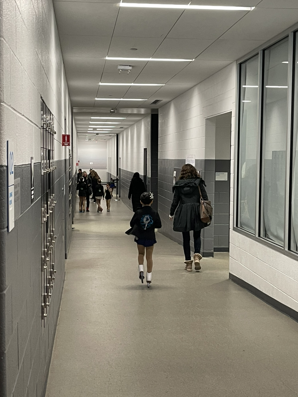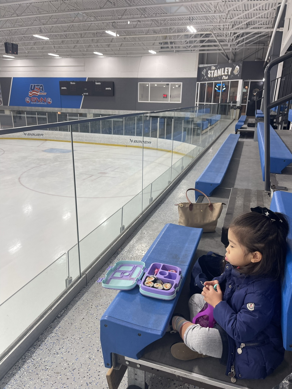 경기는 시카고 근교의 Evanston이란 마을에서 열렸어요. 이제 막 피겨 스케이트 시즌이 이제 막 시작되었기 때문에 일리노이주에서 피겨 한다는 어린이들은 다 모인 것처럼 북적였죠. 아이도 평소와는 다르게 예쁜 남색 드레스도 입고, 제가 아침에 머리도 발레리나처럼 올려주었어요. 옆에 반짝이는 헤어핀으로 장식도 하고요. 경기가 시작되고, 윤서의 순서는 두 번째라 금세 차례가 되었지요. 베이식 레벨에서는 아직 음악을 전체 다 사용하지 않고 1분 정도 길이로 만들어서 출전하거든요. 링크장에 아이 이름이 불리고 문이 열리자 씩씩하게 윤서가 링크장 안으로 혼자 들어갔어요. Disney 영화 Coco 음악이 흘러나오기 시작하고 아이의 공연이 시작되었죠. 그 큰 빙상장 위에서 떨릴 법도 한데 평소 연습한 데로 하나씩 하나씩 해나갔죠. 도대체 그 1분이 어떻게 지나갔는지 모르겠어요. 아이 모습 하나라도 놓칠세라 영상 찍으며, 또 아이에게 엄마 응원 소리가 들릴 수 있게 크게 손뼉 치고 응원하면서 그렇게 1분이 눈 깜짝할 사이에 지나갔어요.