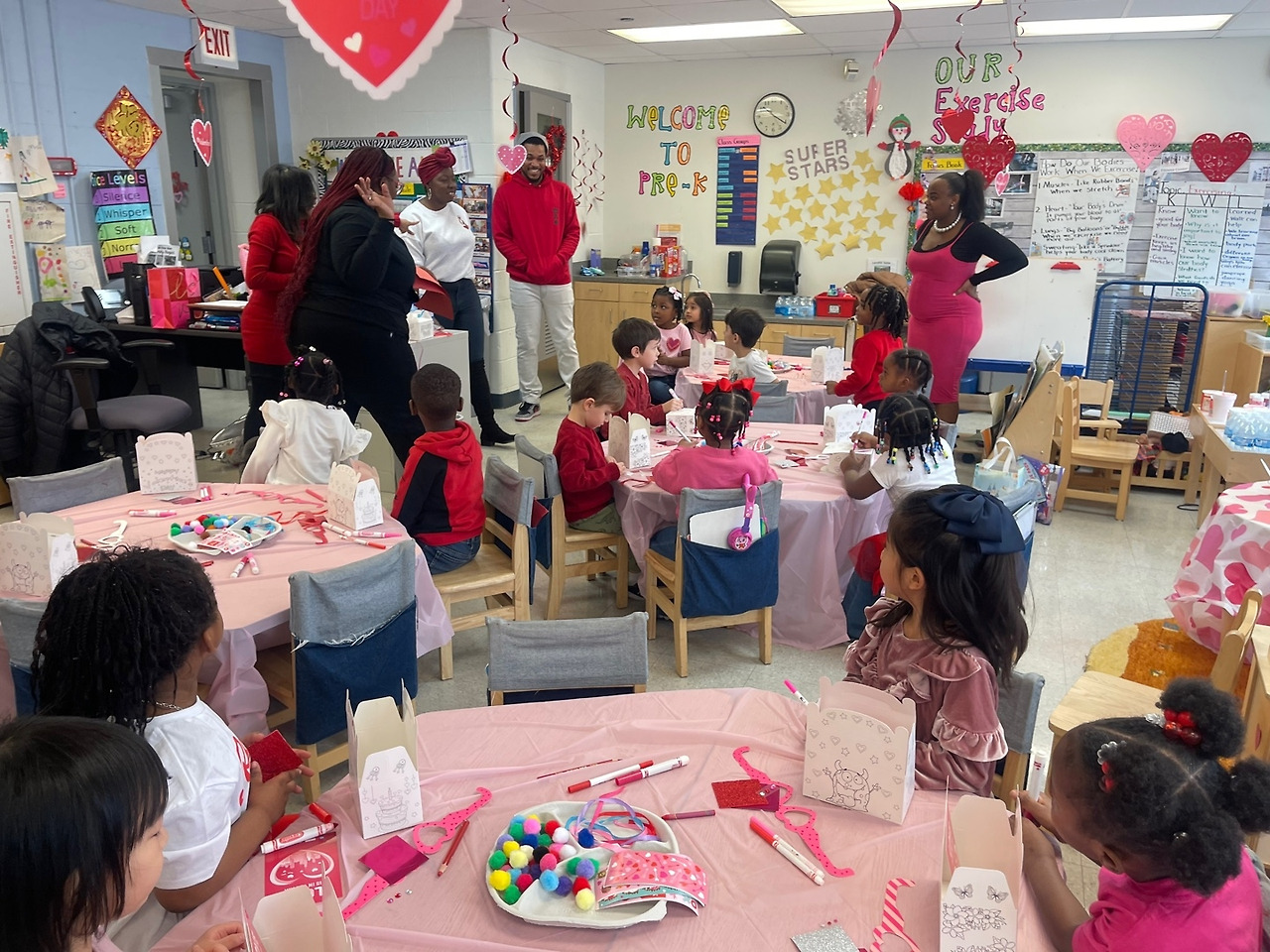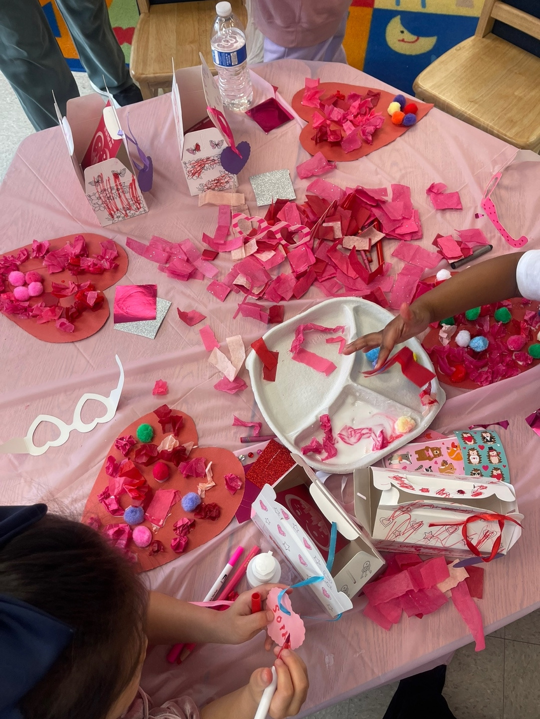 아이들은 테이블에 옹기종기 앉아 선생님이 준비한 발렌타인데이 액티비티를 했어요. 하트 모양 쿠키에 아이싱과 스프링클로 장식하기, 쿠키 박스 색칠하기, 습자지로 하트 만들기 등등. 그리고 마지막 하이라이트는 각자 집에서 만들어 온 발렌타인데이 메일 박스에 친구들이 카드를 넣어주는 이벤트였지요.