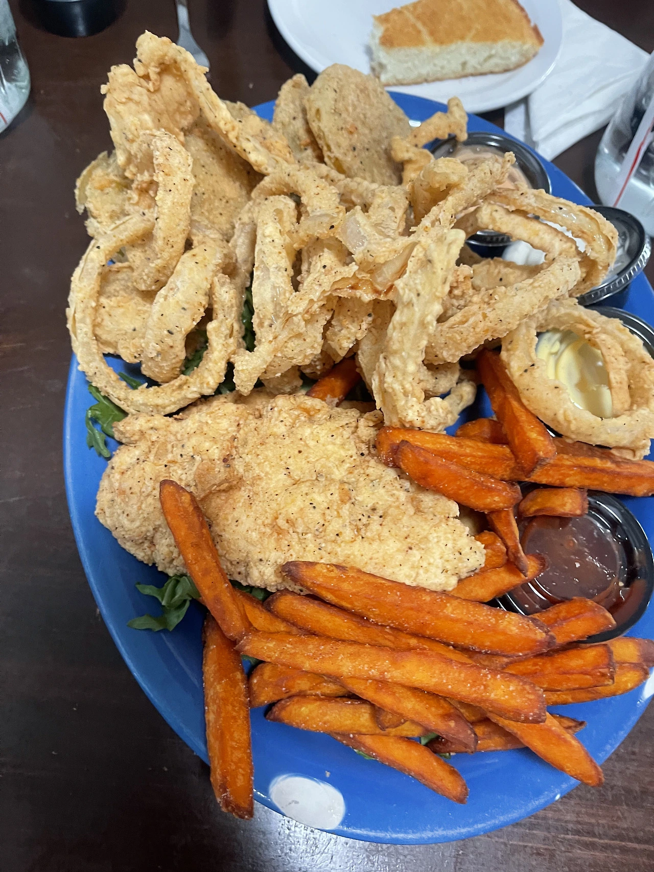 그리고 마침내, 저는 진짜 30년 동안 너무나도 궁금했던 오리지널 프라이드 그린 토마토를 맛볼 수 있었습니다. 정말 맛있었어요! 초록색 단단하고 새콤한 토마토에 부드러운 튀김옷을 입혀 아주 바삭하면서도 새콤달콤한 아주 미묘한 조화가 환상적인 맛이었죠. 남부라 튀김 요리에 자신이 있는지 유독 튀김 메뉴가 많았는데, 아이들을 위해 주문한 프라이드치킨, 양파링, 고구마튀김 모두 대성공이었어요.