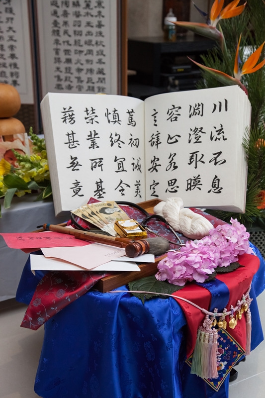 그럼 기억을 더듬어 돌상에 어떤 것들을 올렸는지 한 번 얘기해볼까요? 병풍은 붓글씨를 쓰시는 제 외할머니가 만들어주신 것을 올렸어요. 보통 딸 돌상에는 화접도나 책가도 같은 민화 그림이 있는 것을 사용하던데, 빌리는 것보다 우리 할머니가 직접 서예 하신 것을 올리면 나중에 윤서가 커서 말귀를 알아들으면 이야기를 해줄 수 있을 테니까요. 더 의미가 있잖아요.