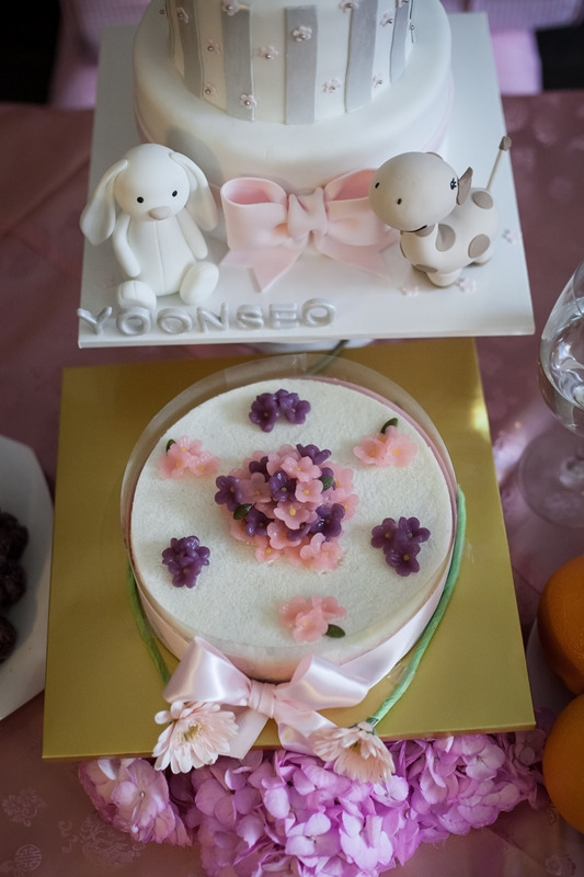 슈가 케이크는 예전부터 눈여겨보았던 동네 케이크 가게에서 주문했어요. 사실 결혼식 때 주문을 하고 싶어서 찜해둔 곳이었는데, 그때는 외부에서 가져오는 것이 어렵다고 해서 다른 특별한 날 주문하려고 따로 저장해둔 곳이죠. 내가 원하는 콘셉트, 크기, 컬러를 가져가면 케이크 디자이너 분과 상의를 해서 나만의 케이크를 만들 수 있어요. 전 아기 돌잔치에 올릴 거니까 핑크, 화이트 컬러에 아기 동물들을 장식했죠.