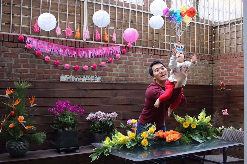 요즘 돌상은 보통 동양식, 서양식 이렇게 둘 중에 하나를 골라서 콘셉트를 잡더라고요. 저도 인스타를 보면서 어떤 것이 좋을까 고민을 하다 두 개 다 해보기로 했어요. 집에서 하기 때문에 온 집안을 다 파티 장소로 활용할 수 있는 점이 좋았어요. 저희 집 같은 경우는 작은 야외 베란다가 있는데, 남은 꽃으로 장식을 하니 훌륭한 포토존이 되었지요.
