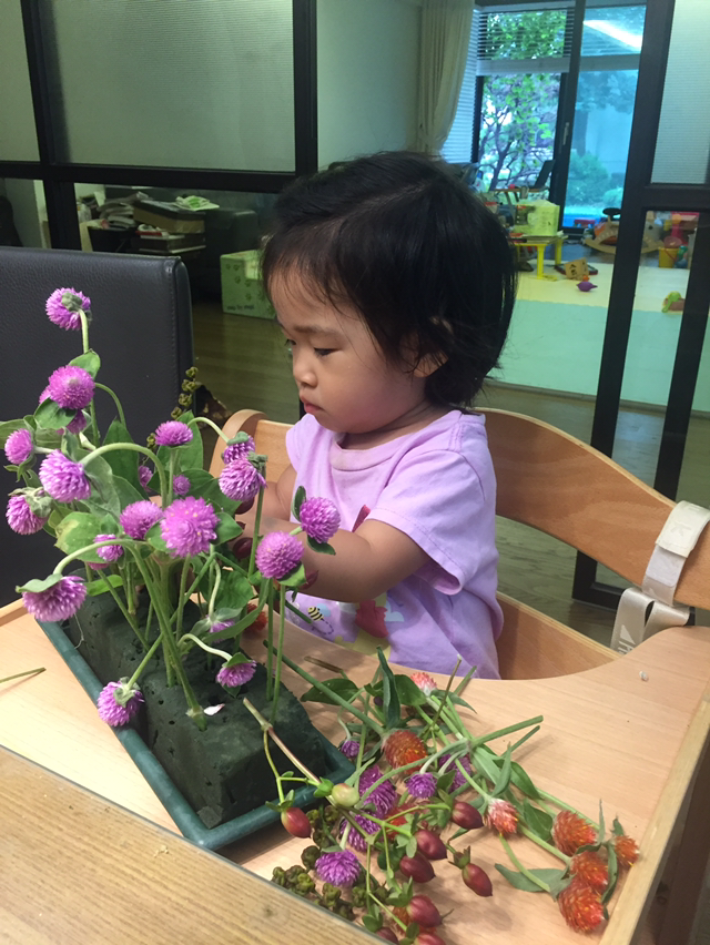 정말 놀라웠던 것은 윤서 앞에 제가 오아시스를 하나 주고 꽃을 다듬어 주니 윤서가 엄마 따라 하나하나 오아시스에 꽃꽂이를 하는 게 아니겠어요! 고슴도치 엄마 같은 소리로 들릴 수도 있겠지만, 정말이랍니다. 아마도 윤서가 가장 좋아하는 놀이인 생일 케이크에 초꼽기에서 배운 것 같은데요, 여기저기 돌려보며 집중력을 발휘해 꽃꽂이를 하는 모습이 정말 신기하고 귀여웠어요. 아기에겐 뭐든지 못하게 하는 것보다, 뭐든지 혼자 다 해보게 하는 것이 좋은 것 같아요. 천천히 자기 만의 속도로 할 수 있는 시간을 주고요. 아이 교육에 대한 제 기본적인 생각이에요. 온몸에 생크림 범벅이 되더라도 혼자 케이크에 초 꼽는 것을 하게 내버려두니 이렇게 어느 날 멋진 꽃꽂이를 선보여 엄마를 감동시키다니요!