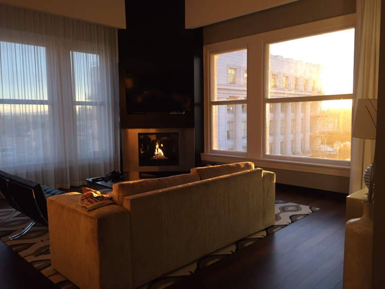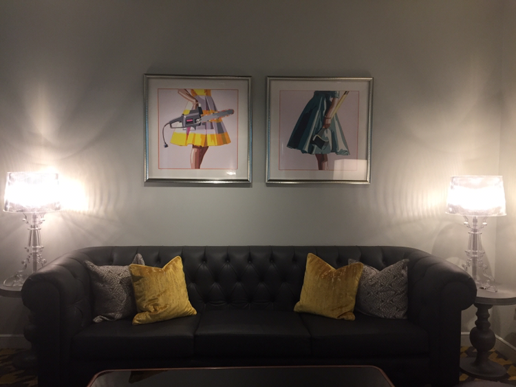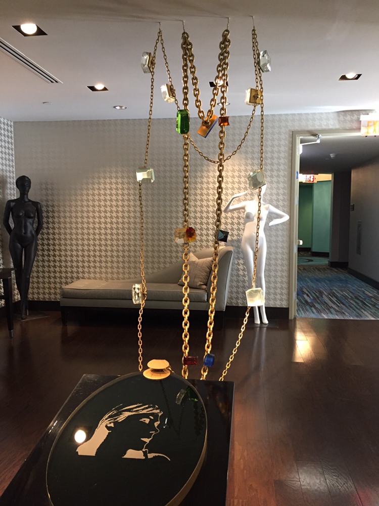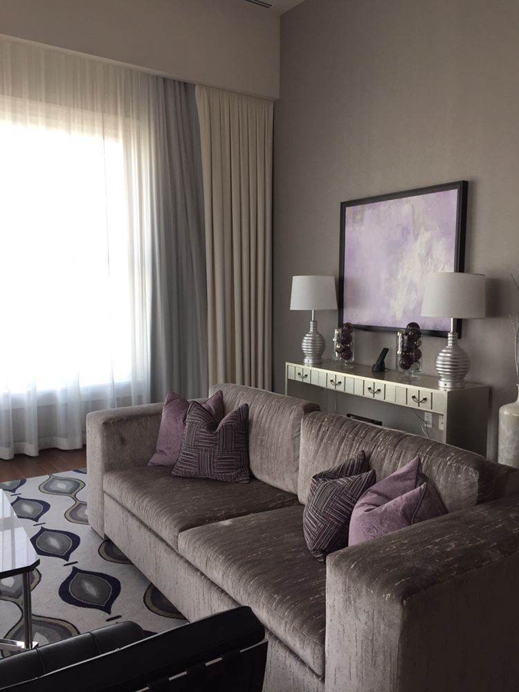 이번에 예약한 호텔은 Nines라는 호텔이었습니다. 포틀랜드에서 요즘 가장 유명하다는 Ace 호텔 사이에서 잠깐 고민을 하긴 했지만, 그래도 저희는 18개월 아기가 있으니 너무 힙스터들의 호텔보다는 편안함을 택했습니다. 호텔 위치는 포틀랜드 시내의 딱 중심에 있었습니다. 바로 앞에 큰 광장이 있었는데 사방으로 온갖 쇼핑몰과 백화점들이 있는 중심지였죠. 호텔이 크진 않았지만, 보라색을 메인 컬러로 한 인테리어 디자인에 여느 호텔에서는 쉽게 보기 힘든 감각적이고 패셔너블한 아트 작품들로 꾸며져 호텔을 구경하는 재미를 주었습니다. 마치 패션, 장신구 박물관을 둘러보는 듯한 느낌이었어요.