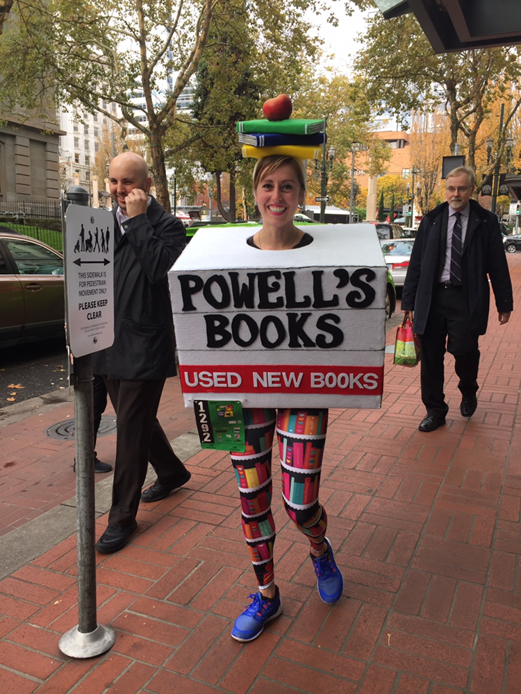 마침 핼러윈 데이였던 그 날, 호텔 앞 거리에는 핼러윈 코스튬 입은 사람들이 많이 지나다녔는데, 그중에 단연 사람들의 주목을 받은 사람이 있었습니다. 바로 포틀랜드의 명물, 미국의 가장 큰 독립 서점인 Powell's Books의 코스튬을 입은 여성이었지요. 포틀랜드 소개 기사에 항상 빠지지 않고 등장했던 그곳, 궁금했던 파웰 북스는 정말로 포틀랜드 사람들에게 큰 사랑을 받고 있는 곳이었습니다.