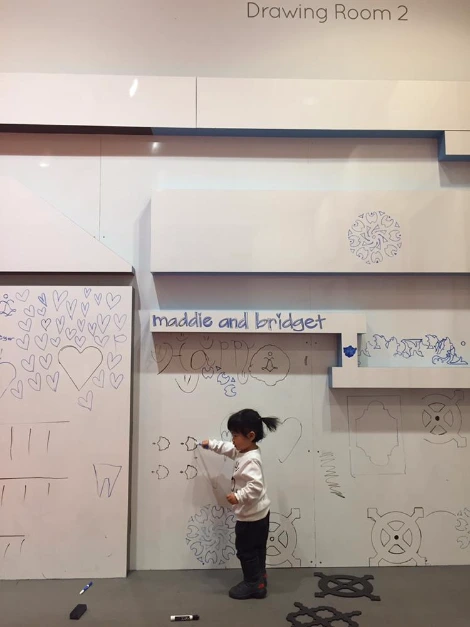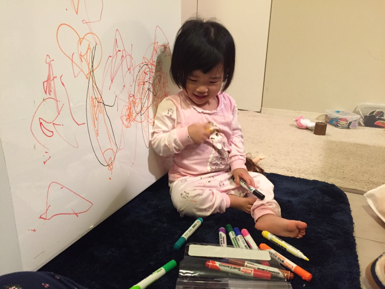 서울에 다녀온 후 저희 집에는 새로운 게 하나 생겼어요. 바로 윤서의 냉장고 드로잉북. 윤서 이모가 챙겨준 화이트보드 시트지를 냉장고 앞면에 붙였더니 사이즈가 딱 알맞았어요. 두툼한 카펫을 깔아주고 그 위에 색색가지 사인펜을 주었더니 부엌 한편에 윤서의 작은 미술 아뜰리에가 만들어졌지요. 시카고 미술관의 드로잉 룸처럼요. 그리고 윤서는 하나씩 부엌 서랍을 열어가며 쌀, 콩, 랩 등 다양한 생활 속 미술 도구들을 발견해 작품에 활용하고 있어요. 요즘 부쩍 엄마한테 딱 붙어 있으려는 통에 요리를 하기가 쉽지 않았는데, 이렇게 제 옆에서 윤서는 그림을 그리고 노니 윤서는 윤서대로 즐겁고, 저도 일하기가 한결 수월해졌지요.