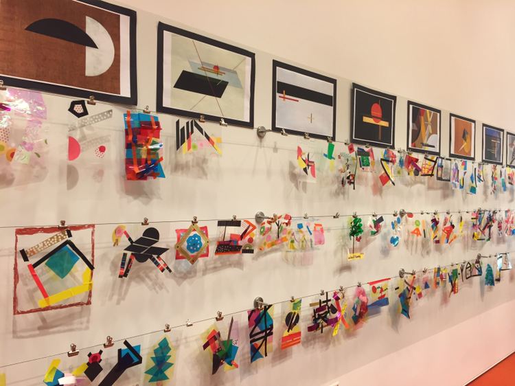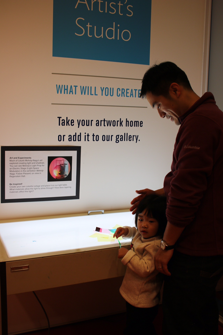 오늘 오랜만에 방문하니, Family Room에서는 이번 주까지 열렸던 특별전 Moholy-Nagy: Future Present를 주제로 프로그램이 운영되고 있었어요. 색종이, 셀로판지, 컬러펜, 가위, 스티커 등으로 오리고, 그리고, 붙여서 나만의 작품을 만들어보는 시간이었지요. 이 곳을 방문하는 아이들은 나이가 윤서처럼 아주 어린아이부터 중학생 정도까지 있기 때문에 작품의 수준도 다양해요. 다 만든 작품은 집에 가져갈 수도 있고, 또 원하면 이 곳에 기증을 해서 벽에 걸어둘 수도 있지요. 아이들에게도 내가 만든 작품이 미술관에 걸려있다는 생각을 하게 된다면 더 이 곳에 애착을 갖고, 또 미술을 좀 더 적극적으로 즐길 수 있겠지요? 이 곳은 지도 교사가 따로 있는 건 아니기 때문에 아이들은 자유롭게 재료를 가져다가 하고 싶은 만큼, 하고 싶은 대로 작품을 만들 수 있어요.