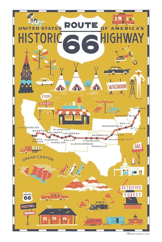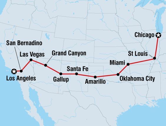 루트 66는 1926년에 건설되어 일리노이 주 시카고 현재의 윌리스 타워 앞에서 캘리포니아 주 로스앤젤레스 산타모니카 비치까지 미국 중서부 8개 주(일리노이, 미주리, 캔자스, 오클라호마, 텍사스, 뉴멕시코, 애리조나, 캘리포니아)를 관통하는 약 3940km(2450마일) 길이의 고속도로'였습니다'. '캘리포니아 드리밍'을 꿈꾸며 동부에서 서부로 삶의 터전을 옮기려는 이주민들의 길이기도 했지요. 소설가 존 스타인벡의 '분노의 포도'에도 등장하고, 가수 엘비스 프레슬리, 밥 딜런의 음악에 '청춘의 추억'으로 노래되기도 했습니다.