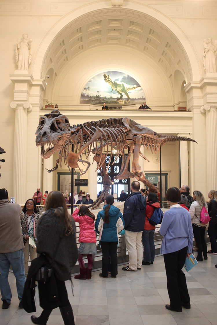 여기 1층에 전시되어있는 뼈는 모두 진짜인데, 딱 하나만 가짜인 부분이 있습니다. 바로 머리지요. 티라노사우르스는 머리가 엄청 크고 무거운 공룡이었다고 해요. 뼈 무게만으로도 600파운드에 달해 안전상의 이유로 진짜 얼굴뼈는 2층에 따로 전시가 되어있습니다. 가까이에서 볼 수 있기 때문에 더 실감 나지요. 티라노사우루스는 난폭한 육식 공룡이었기 때문에 그 시대 공룡 중에서도 가장 상위 계층에 속해있었고, 또 먹잇감을 발견하면 무참하게 공격을 한 후에 먹었다고 합니다. 이렇게 둘 중에 하나가 화석이 되어 만난 게 참 다행이란 생각이 들었습니다.