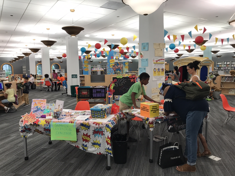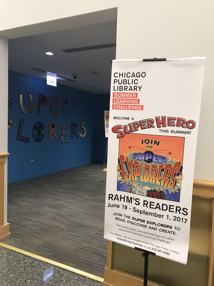 아이는 도서관에 들어서자마자 '꺄악, 꺄악' 소리를 내면서 마치 디즈니월드에 온 것처럼 좋아 날뛰었습니다. 이곳저곳에 아이들이 좋아할 만한 색종이며, 장난감들이 가득가득 있었고, 또 새로 개장을 해서 그런지 알록달록 장식을 해놓아서 아이는 더욱 신이 났습니다. 특히 여름 방학을 맞아서 이 곳에서는 'Super Hero'를 찾는 홍보 프로그램을 진행 중이었는데, 1. 도서관에서 500분 이상 책을 읽고(Read), 2. 글짓기나 그림을 그리는 창작 활동을 하고(Create), 3. 미술관이나 과학박물관에서 무료로 진행하는 체험 클래스(Discover)를 들어서 이 세 가지를 모두 충족하면 책 선물을 주는 프로그램이었습니다. 0살부터 13살까지 누구나 참여할 수 있었지요. 도서관 입구에선 한 아이가 이 프로그램을 소개하고, 등록을 도와주는 자원봉사를 하고 있었습니다. 아이들에 의해 운영되는 아이들을 위한 도서관 행사였지요.