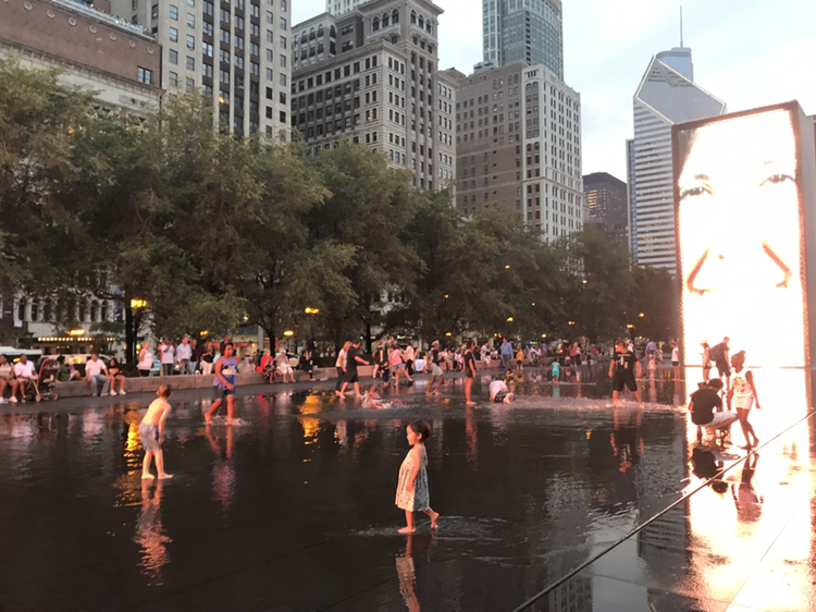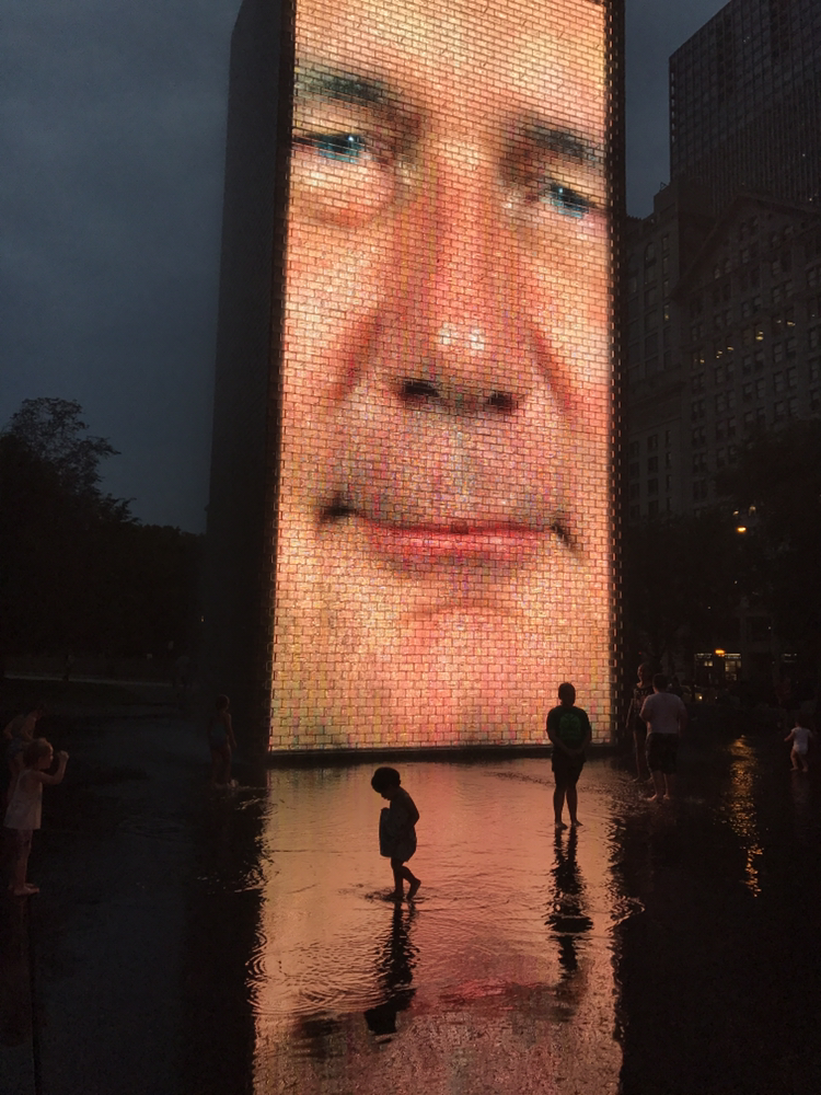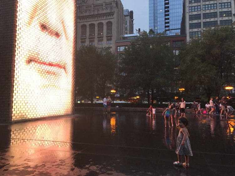 제가 생각했을 때 시카고의 자랑거리를 꼽으라면 처음으로 말하고 싶은 것이 바로 퍼블릭 아트입니다. 길거리 곳곳에서 샤갈의 대형 모자이크나, 피카소와 알렉산더 칼더의 공공 미술 작품을 발견할 수 있지요. 그중에 이 여름에 꼭 소개하고 싶은 것은 바로 밀레니엄 파크에 있는 '더 크라운 파운틴(The Crown Fountain)'입니다. 스페인 출신의 하우메 플렌사(Jaume Plensa)가 2004년에 제작한 이 공공 미술 작품은 아트이기도, 또 분수에 물이 나오는 여름에는 아이들의 놀이터가 되기도 합니다.