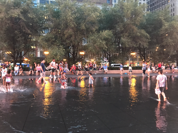 이 곳은 대표적인 '유니버설 디자인'의 공공 아트입니다. 누구나 쉽게 들어오고 나갈 수 있고, 즐길 수 있는 곳입니다. 물에 들어가서 흠뻑 젖고 싶은 아이들도, 그 모습을 지켜보며 쉬고 싶은 어른들도, 그리고 뜨거운 더위를 식히기 위해 잠깐 들르는 관광객도 누구나 하루의 쉼표를 찍을 수 있는 공간이지요. 문턱도 없고, 물이 깊지도 않아 휠체어를 타고 물에 들어갈 수도 있습니다.