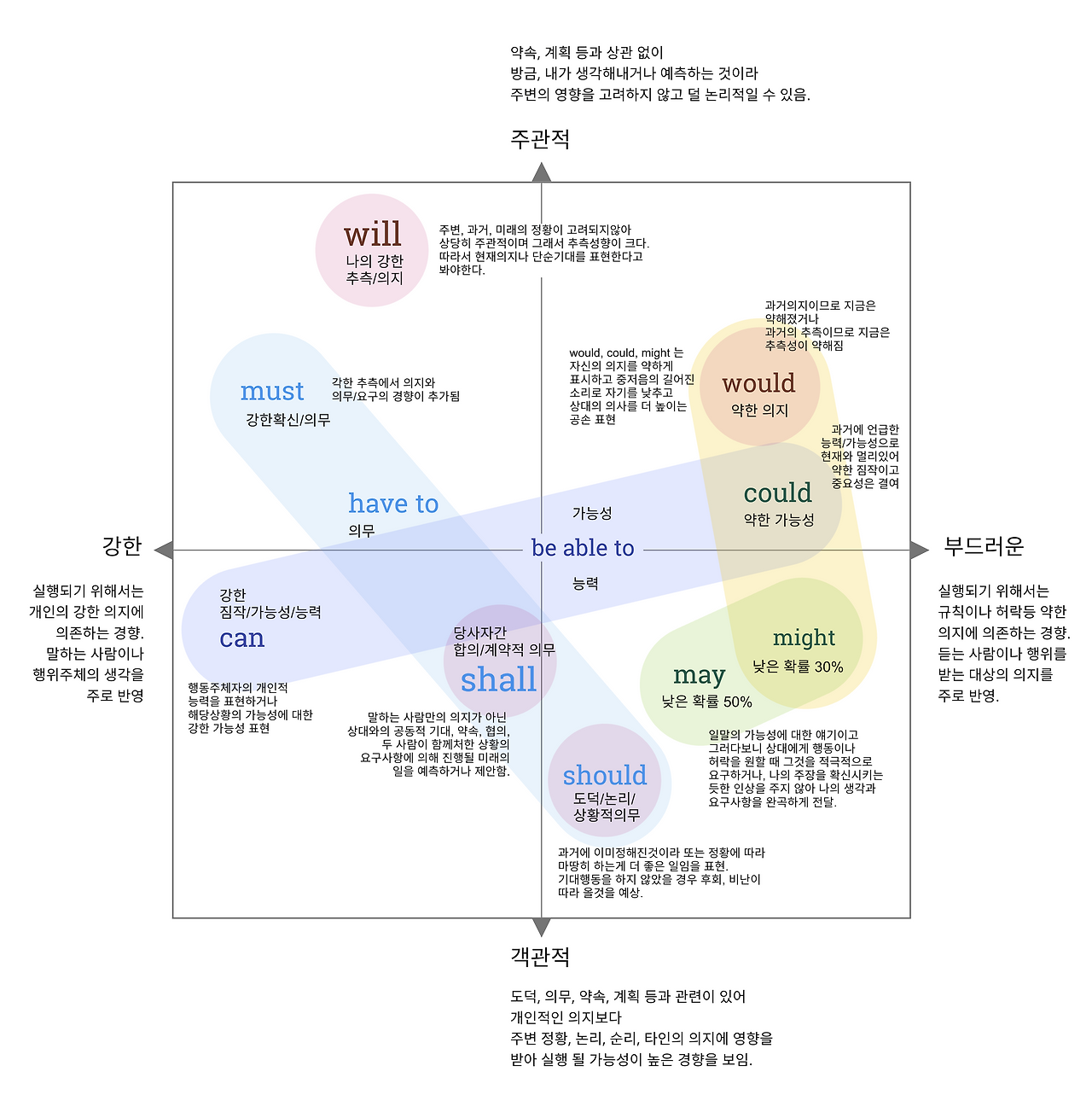 다음은 여러 조동사를 위의 맵에서 정의한 개념을 넣어서 해석해 보았다.