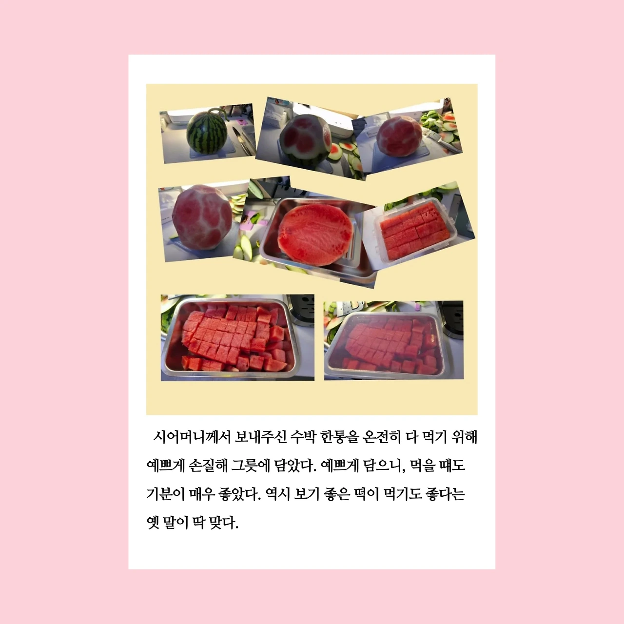 본가에서 돌아온 남편이 수박과 장어를 들고 왔다. 장어는 내가 전혀 먹지 않으니 남편 몸보신용으로 손질해 냉장 보관했다. 수박은 바로 먹을 거라 곧바로 작업에 들어갔다. 수박을 예쁘게 자르고 싶어 유튜브에서 여러 영상을 찾아봤다. 몇 개를 보고 나니 감이 잡혔다. 처음 해보는 방식이었지만 의외로 쉽고, 재미있었다. 통에 담아 놓으니 보기 좋고, 기분까지 좋아졌다.